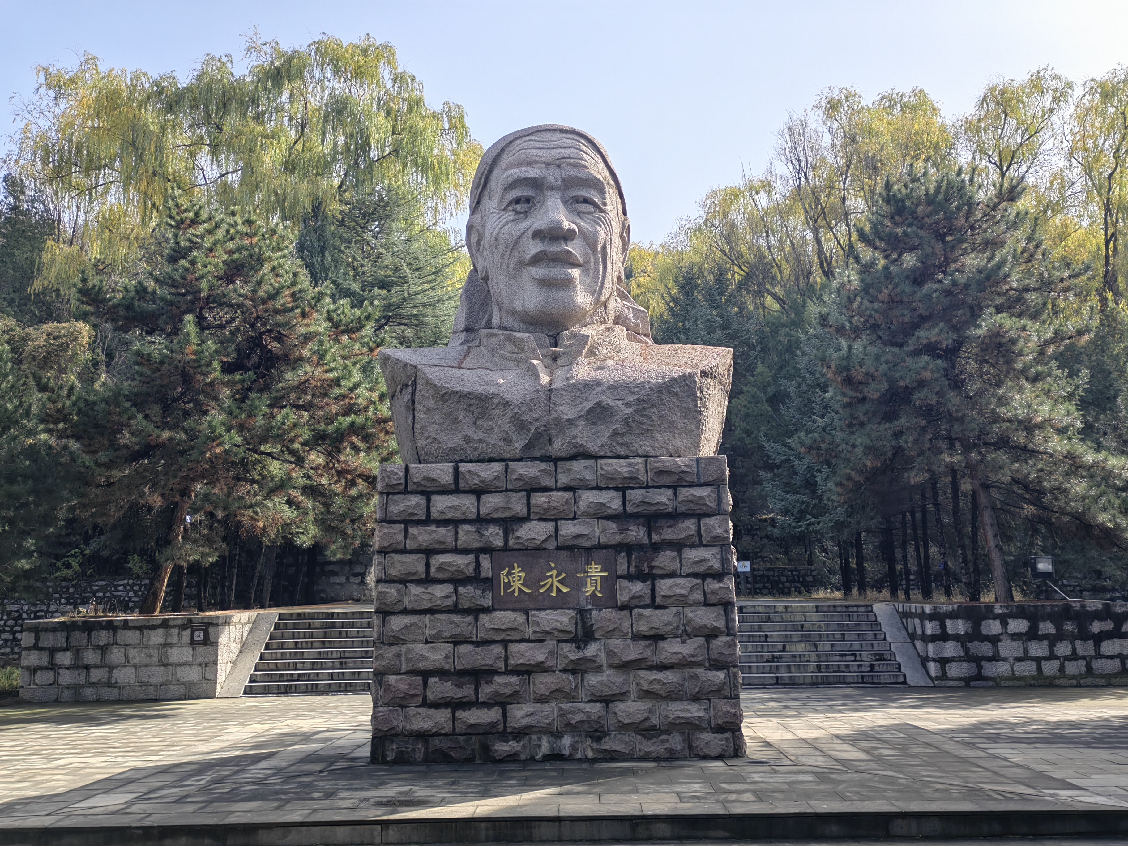 我们开车沿着主路向虎头山驶去,路渐渐变陡,两旁的梯田也愈发清晰。越往上走,歌声似乎听得更真切了,那熟悉的旋律在山谷间回荡,与风声交织在一起。行至山腰,一座大型石雕赫然矗立,正是陈永贵的半身像。他头围白巾,额头上的皱纹深如刀刻,眼神坚定地望着山下的梯田,仿佛仍在凝视着他用一生守护的土地。
