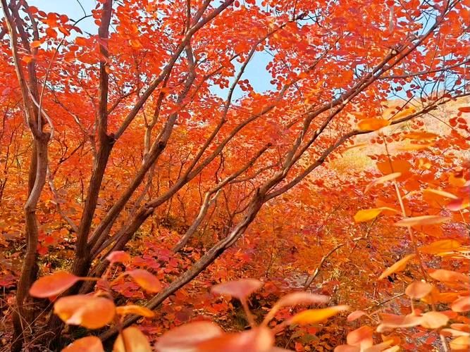 深秋之时,鲁山境内的大山里,万山红遍,层林尽染。尤其是六羊山到文殊寺那一段的红叶,那叫一个壮观。从寒露到霜降,秋风里暗含的肃杀之气,在黄栌的枝叶上演绎出一场裂变。黄栌树,本来在大山之中是不显眼的,可秋风之烈,使它由青到黄,由黄到红。渐渐地,黄栌犹凤凰涅槃,一飞冲天!伏牛山,六羊山,石林路,上演了一场红叶大戏。山路弯弯,丹色轻染,光华群山。远处,峰峦披彩,点点片片,恰似火凤凰轻落云山;近处,团团簇簇,风摇红叶,犹如烟花披彩,散落半山;山路边,黄栌或高或低,或红或黄,揖礼山道旁,笑脸迎仙客,惹得游人抚叶拍照,留住这让人心跳的红叶秋光。
