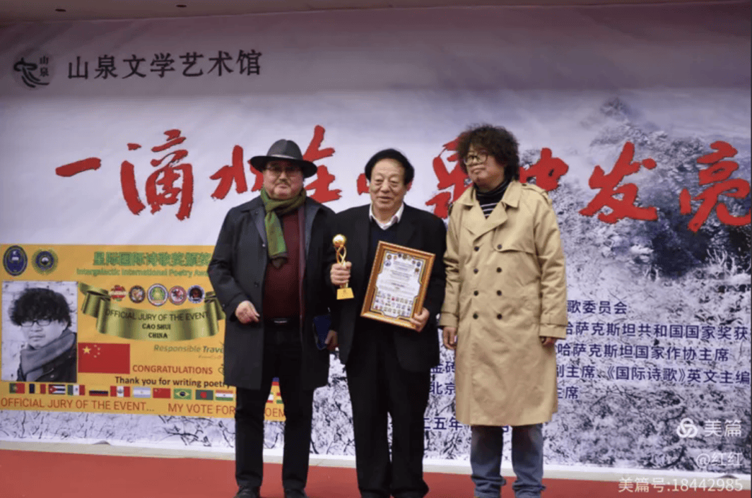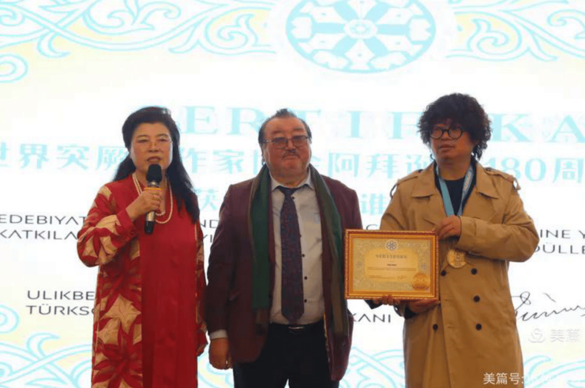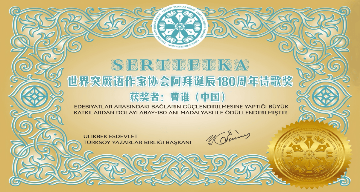 乌鲁格贝克代表世界突厥语协会向曹谁颁发了阿拜诞辰180周年诗歌奖。乌鲁克贝格题写《题赠曹谁》:曹谁是我的天才诗人兄弟/他的诗生来为诺贝尔文学奖而写/他被全球年轻的天才诗人所拥护/他是世界诗歌运动的领袖。