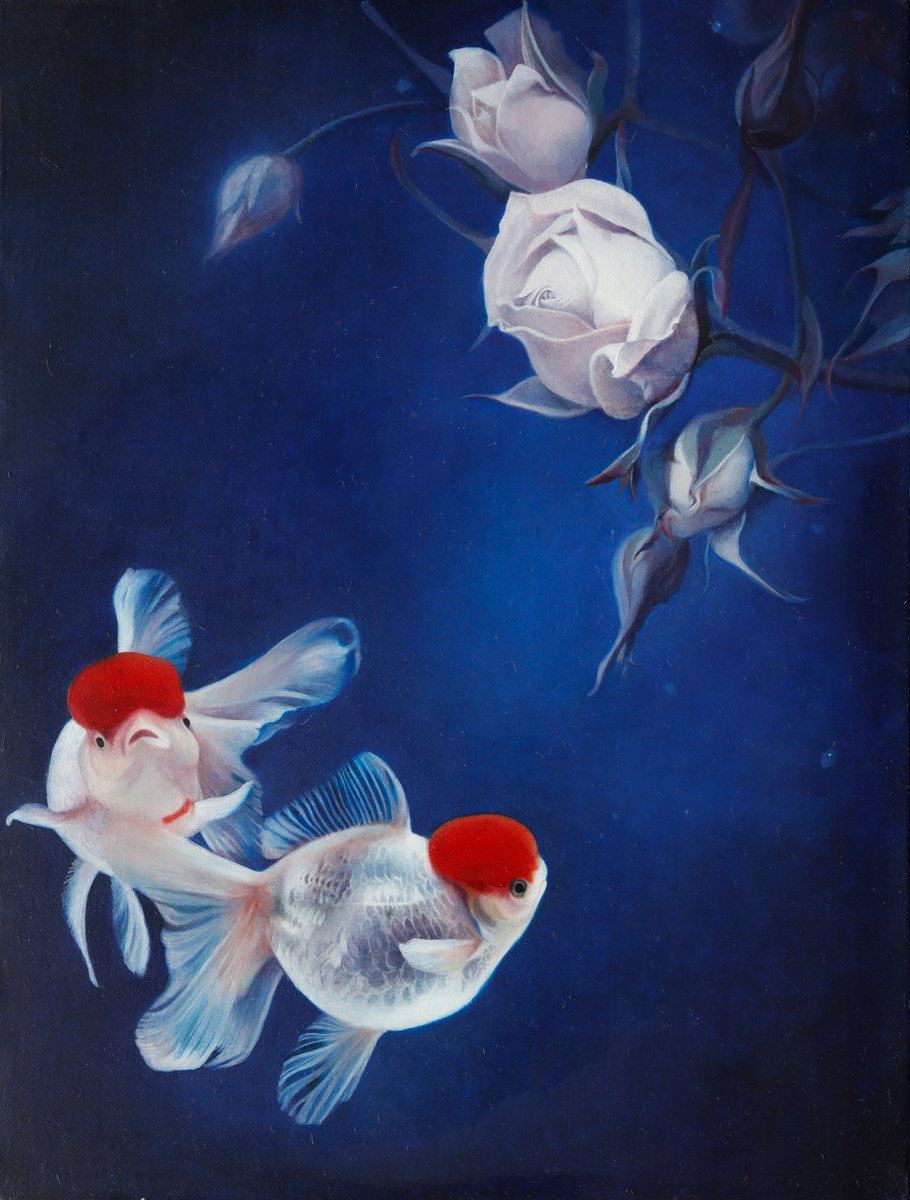你看那墨蓝底色里的金鱼,红顶是裁碎的朱砂痣,鳞光似揉皱的月光,尾鳍轻摆如流云漫过溪石;旁侧的白玫瑰是凝了夜露的云,瓣尖的淡粉是晨雾吻过的痕,连未开的花苞都裹着半盏梦。这哪里是画,是把 “静水流深” 的禅意,溶成了油彩里的呼吸:每一笔都是光影的私语,每一层色都是质感的轻吟,恰似春蚕吐丝,把灵韵织进了画布的经纬。