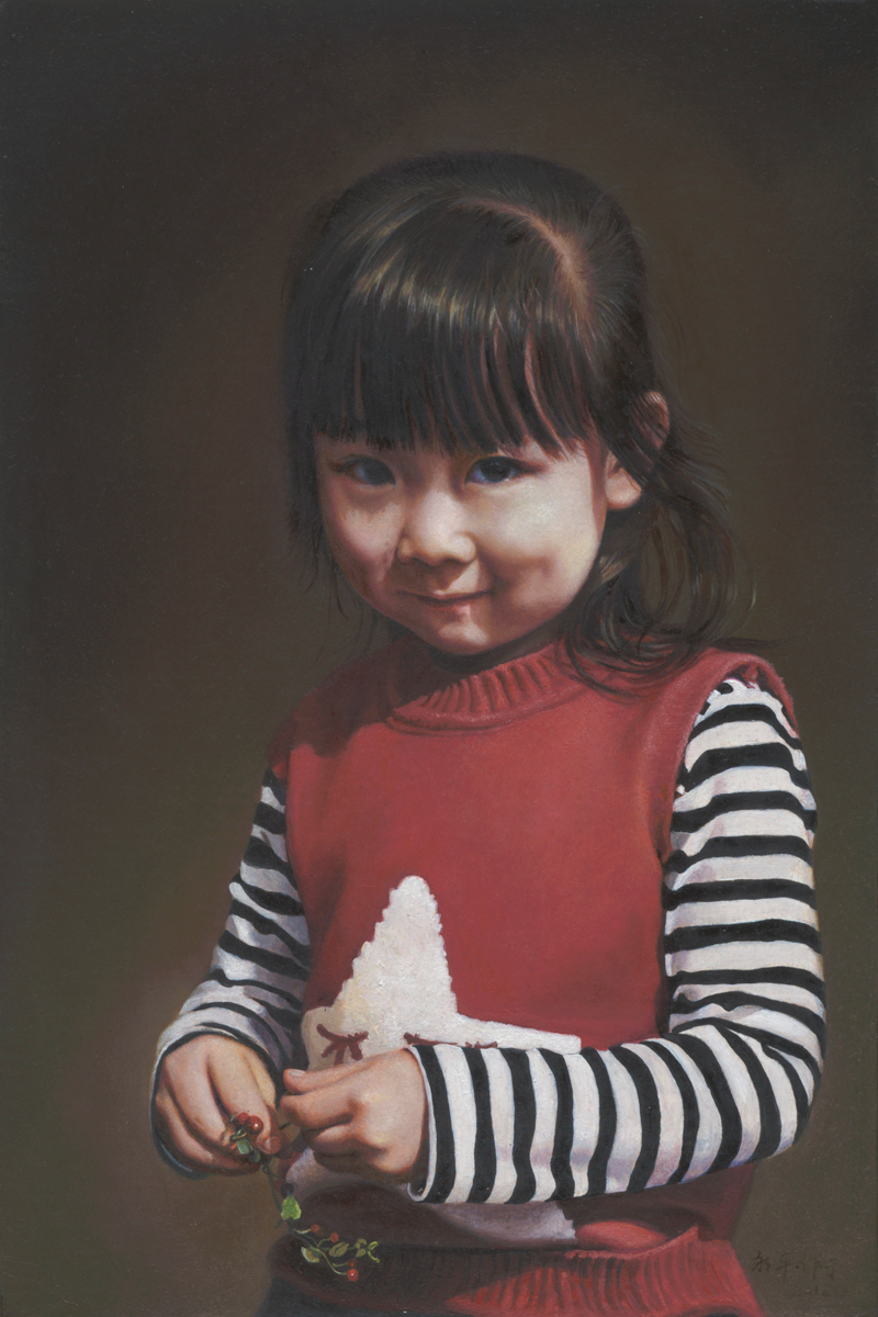 这技法哪里是 “写实” 二字可束?樱桃的红是噙着的霞,玻璃盏的光似揉碎的银;小猫的软毛是春绒裹了暖,布老虎的绣线是年俗跳脱的韵;南瓜的褶子是时光的痕,葡萄的紫是夜浸的蜜 —— 他把颜料熬成了生活的温度:暖黄是秋阳,墨蓝是夜溪,赭褐是光阴的绒毯,连阴影都裹着半分软。