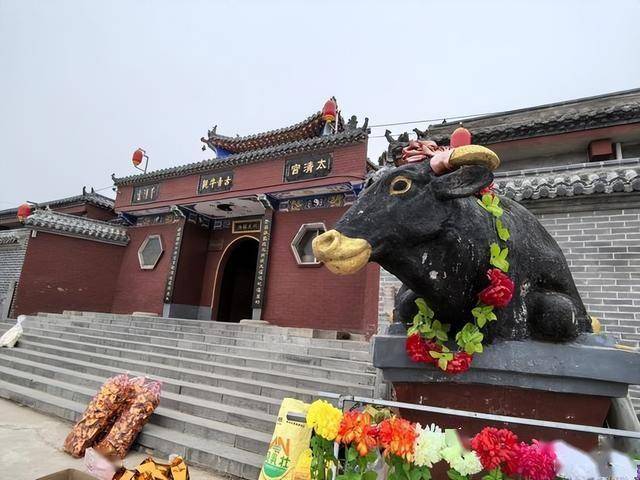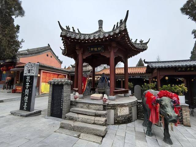 进下清宫正门,院子两侧建筑分别是钟楼、鼓楼。近几年修复的孔子问礼台和问礼亭,有“孔子入周问礼”雕塑和青牛站姿塑像。