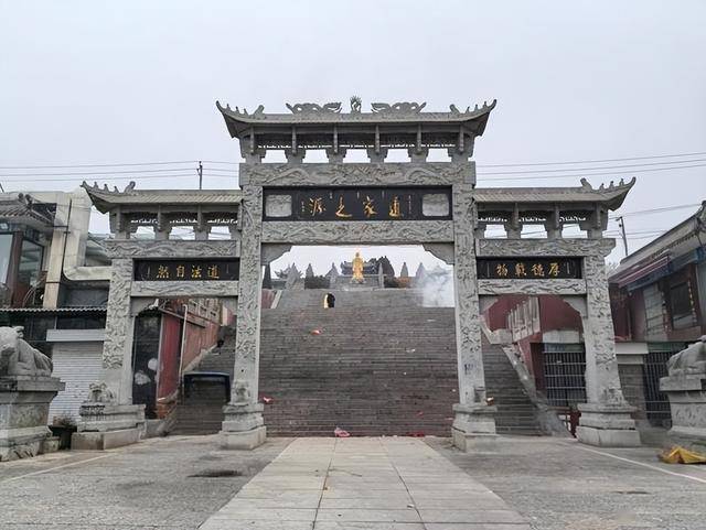 进正门,回头看,楹联是“隐邙山著真经流芳万世,参周礼传论语弟子三千”,横额书“道教之宗”,反映了这里是道教的发源地,上联写老子,下联写孔子。