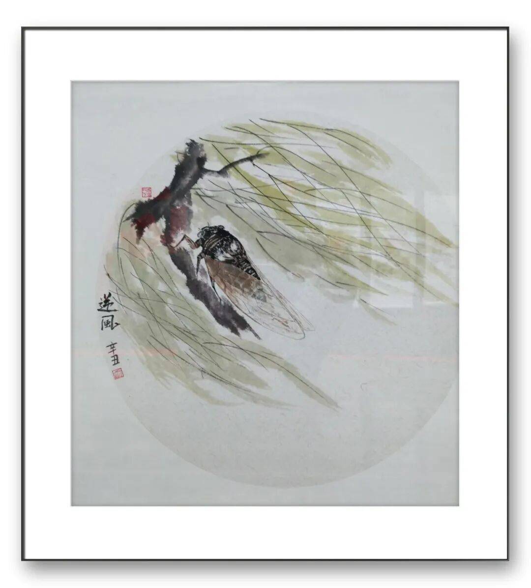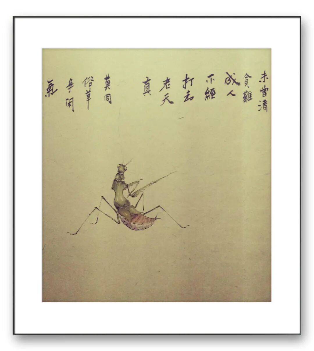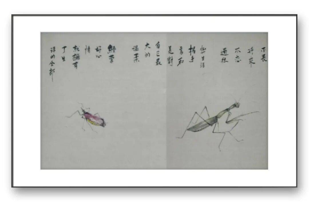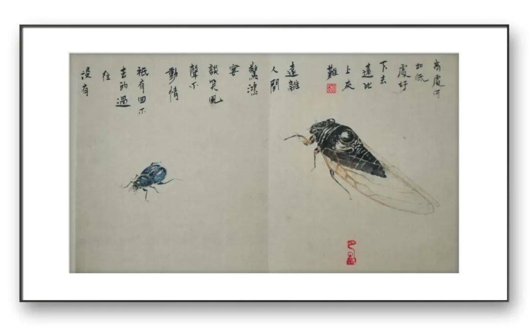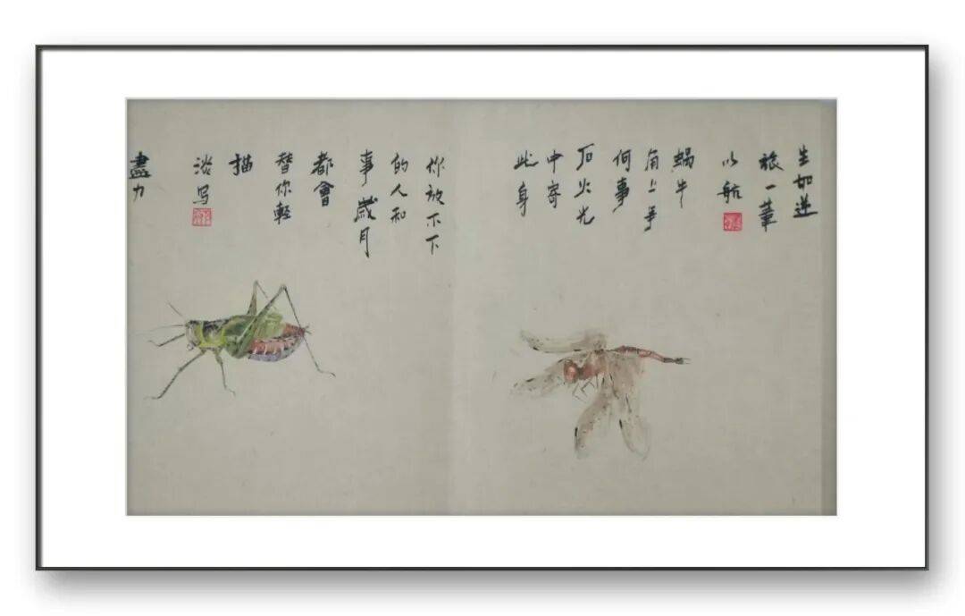 在草虫的刻画上,于先生的用笔更是精细入微却不失洒脱。他善于根据不同草虫的形态特点,调整用笔的力度与节奏。描绘蝴蝶的翅膀时,用笔轻盈飘逸,线条细腻流畅,通过墨色的浓淡变化展现出翅膀的通透感与层次感;刻画蟋蟀、纺织娘等昆虫的肢体时,用笔则精准有力,寥寥数笔便将昆虫肢体的结构与动态勾勒得栩栩如生。这种“粗”与“细”的对比、“刚”与“柔”的结合,使得他的作品在视觉上极具张力,既展现了自然生灵的细腻之美,又彰显了笔墨的写意之趣。
