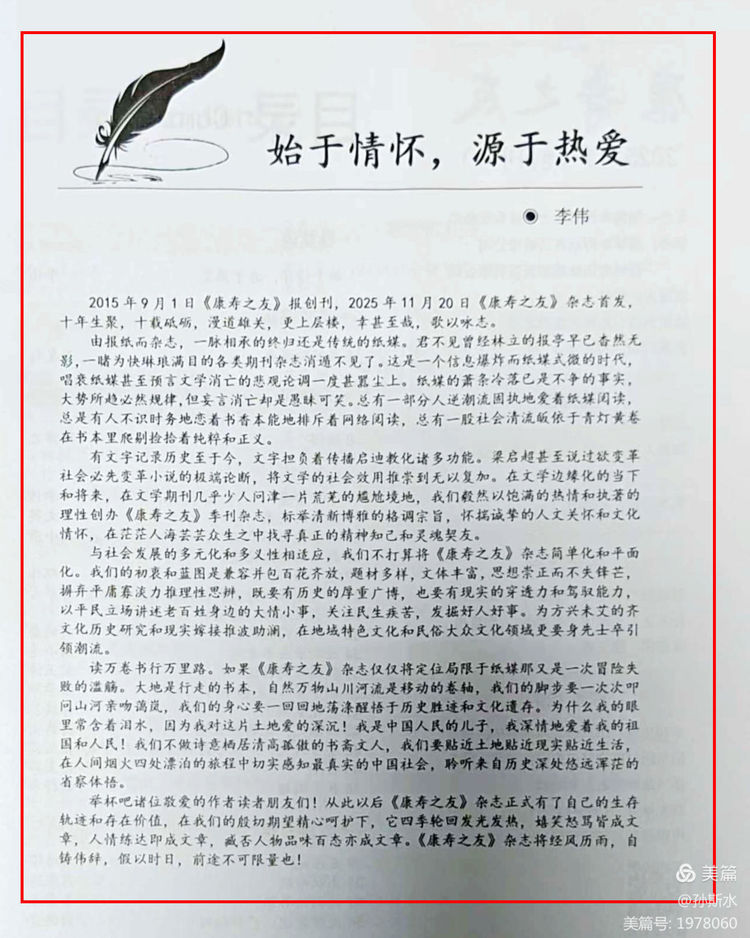作为刊物的灵魂人物,李伟主编在致辞中系统阐述了《康寿之友》的办刊理念与发展蓝图。他表示:“我们不做浮光掠影的资讯搬运工,而是要做中老年朋友可信赖的生活顾问、心灵知己与成长伙伴。”未来,《康寿之友》将坚持“内容为王、服务为本”的核心原则,持续优化栏目设置,增强互动性、实用性与可读性,涵盖健康养生、心理调适、慢病管理、代际沟通、退休规划、兴趣培养等多个维度。同时,杂志将以开放姿态整合资源,联合政府机构、医疗机构、文旅企业、社区组织与公益团体,推动线上线下融合的文化健康活动落地生根,逐步构建覆盖全生命周期的康养服务体系。从“老有所养”到“老有所乐”,再到“老有所为”,《康寿之友》愿成为助力实现美好生活愿景的重要力量。