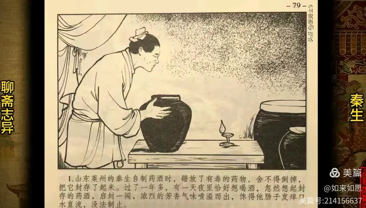 莱州秦生制药酒,误投毒味,未忍倾弃,封而置之。积年余,夜适思饮,而无所得酒。忽忆所藏,启封嗅之,芳烈喷溢,肠痒涎流,不可制止。取盏将尝,妻苦劝谏。生笑曰:“快饮而死,胜于馋渴而死多矣。”一盏既尽,倒瓶再斟。妻覆其瓶,满屋流溢,生伏地而牛饮之。少时,腹痛口噤,中夜而卒。妻号泣,为备棺木,行入殓矣。