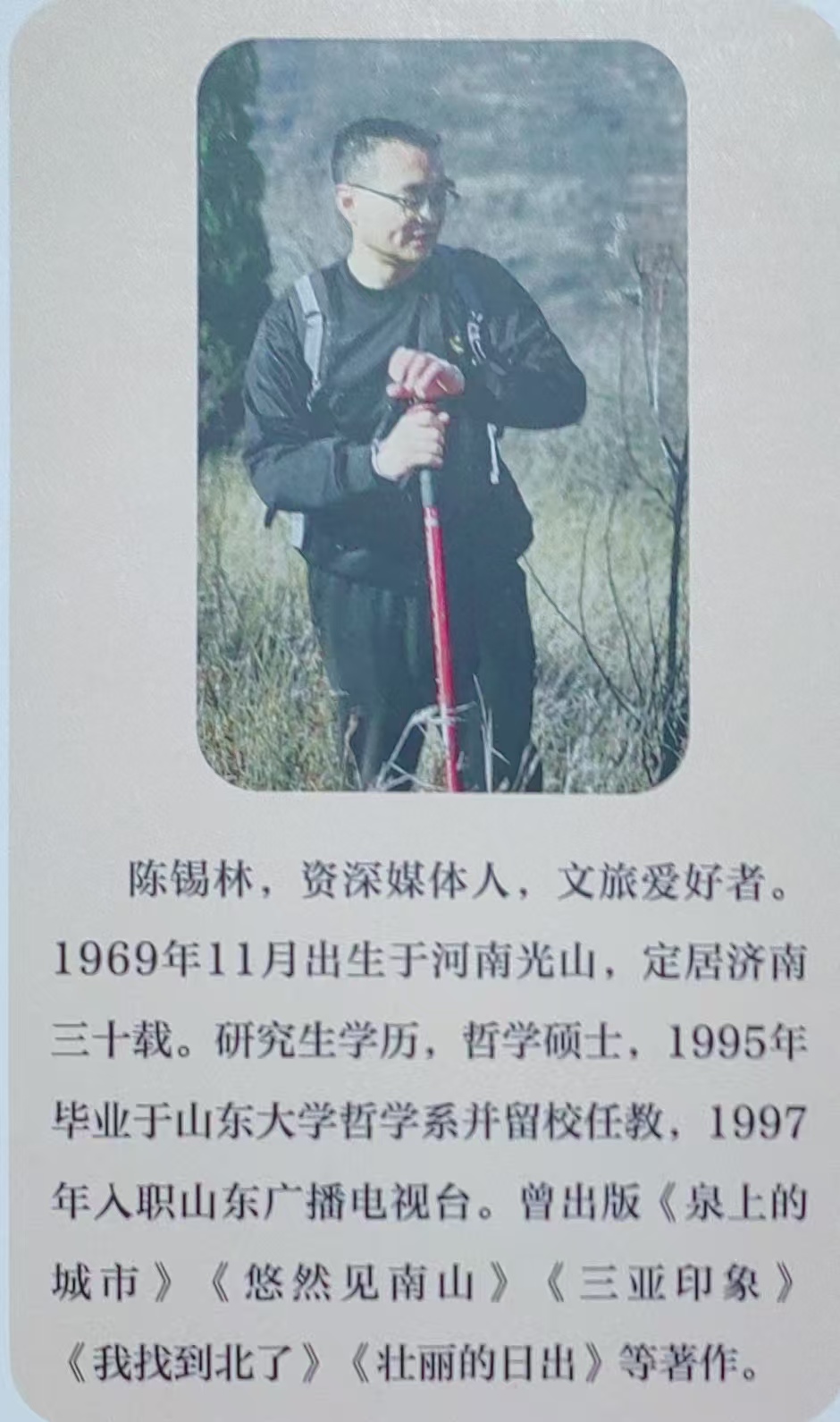 第三个感动就是各位贵人的帮助。这本书从写作到出版,得到许许多多贵人的帮助。除了责编史振伟、朗读刘俊韬外,还有吴晋帮我作封面设计,吴晋是专业的图书设计师,他不仅免费为我设计封面,还最早朗读《齐州九点烟》并入驻喜马拉雅平台;还有刘爱国承担事务联络工作,在印刷过程中忙前忙后,默默付出辛勤汗水;还有林云兄、贾静为我提出宝贵意见,让这本书不断完善;另外还有十几位陪我爬山的兄弟(今天没有邀请),正是因为他们的陪伴和帮助,才让我养成了爬山的习惯并一直坚持至今。今天,我们敬爱的孙老、还有诸位校友、乡友莅临指导,你们都是我的贵人,向你们一并表示感谢!