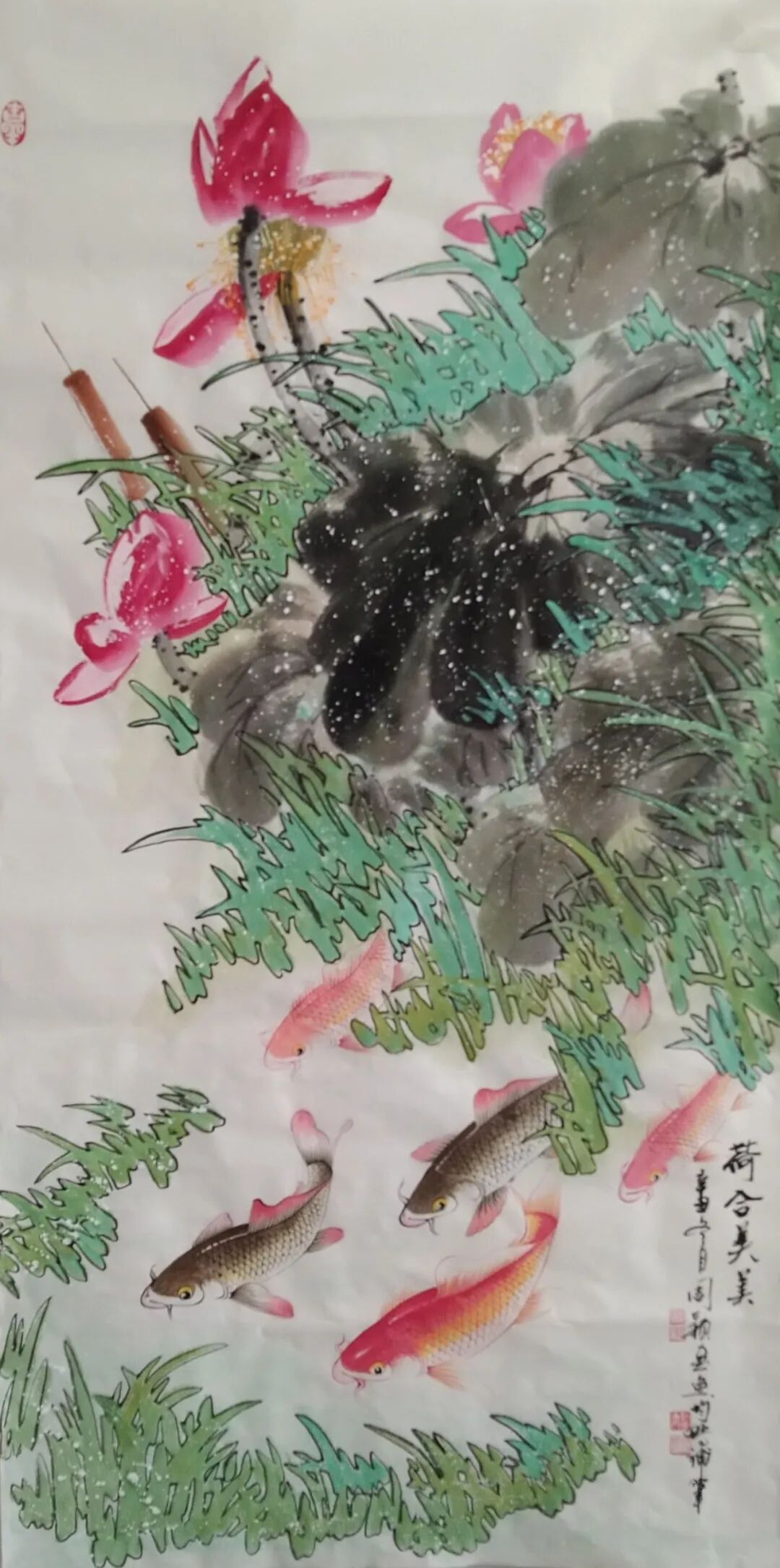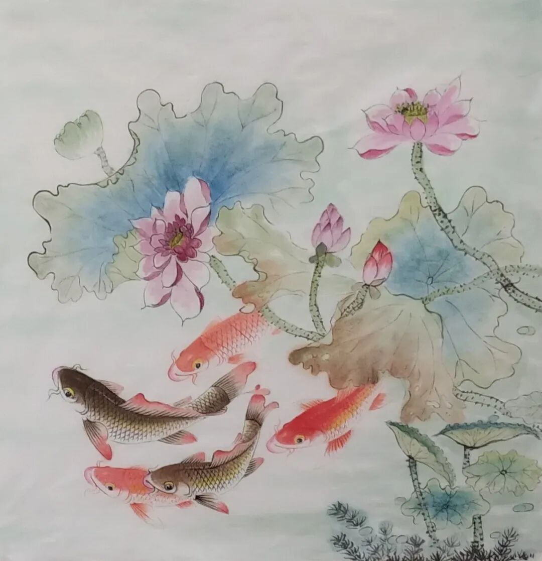 细观其画,色彩明快鲜亮,洋溢着一种欢快、幸福之感;且画工细腻、纹理分明,尤其是,水之线条灵动潇洒,与画中之鱼,穿插呼应,大有“海阔凭鱼跃”之感;而其中的荷叶与涟漪,令诗歌中的意境具象化,从而为画作增添了几分朦胧与婉约。