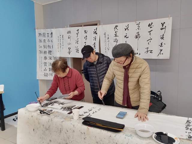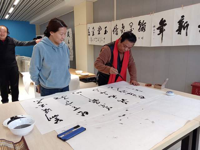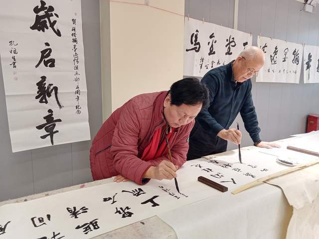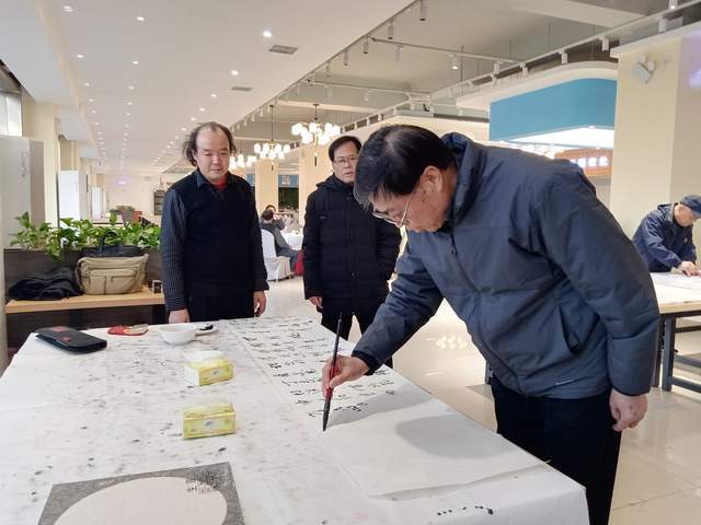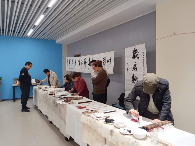 本次年会笔会现场举行了“唐诗之都”书画唐诗启动仪式,全体与会书友共同挥毫,联袂创作40cm×100m王维诗书画长卷。笔墨流转间,王维诗词中的山水意境与人文情怀跃然纸上,将书法艺术与唐诗文化完美融合,尽显“诗中有画,画中有诗”的独特韵味。启动仪式后,常规笔会交流有序开展,书友们铺纸研墨、即兴创作,楷书端庄秀丽,行书潇洒飘逸,草书奔放灵动。俱乐部顾问穿梭于书友之间,对作品逐一进行点评指导,从笔法技巧、结构布局到意境营造,提出了诸多建设性意见,现场交流氛围浓厚。
