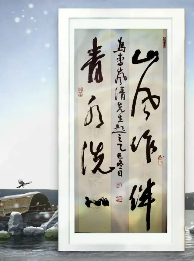 2014年為李嵐清先生撰寫姓名聯一一山風作伴,青水洗心。該聯巧妙將其大名嵐清分別拆解為山風青水,匠心獨運別出心裁,清心雅致自有韻味。