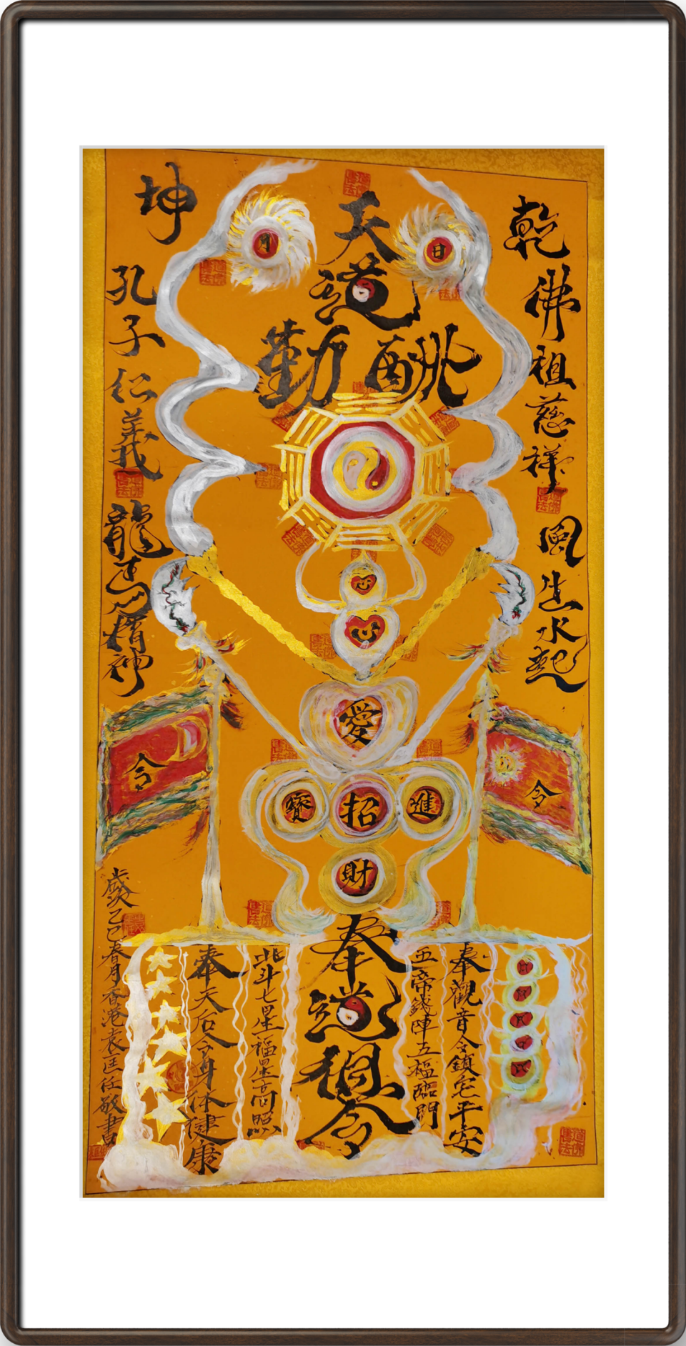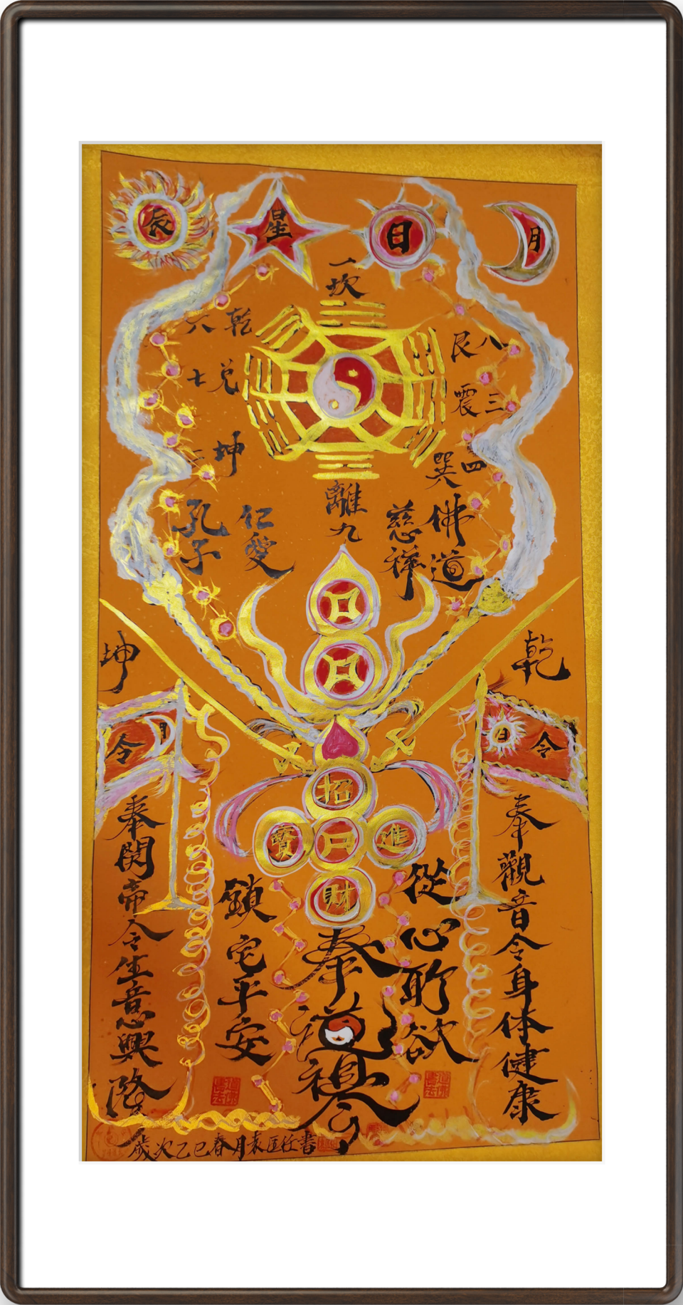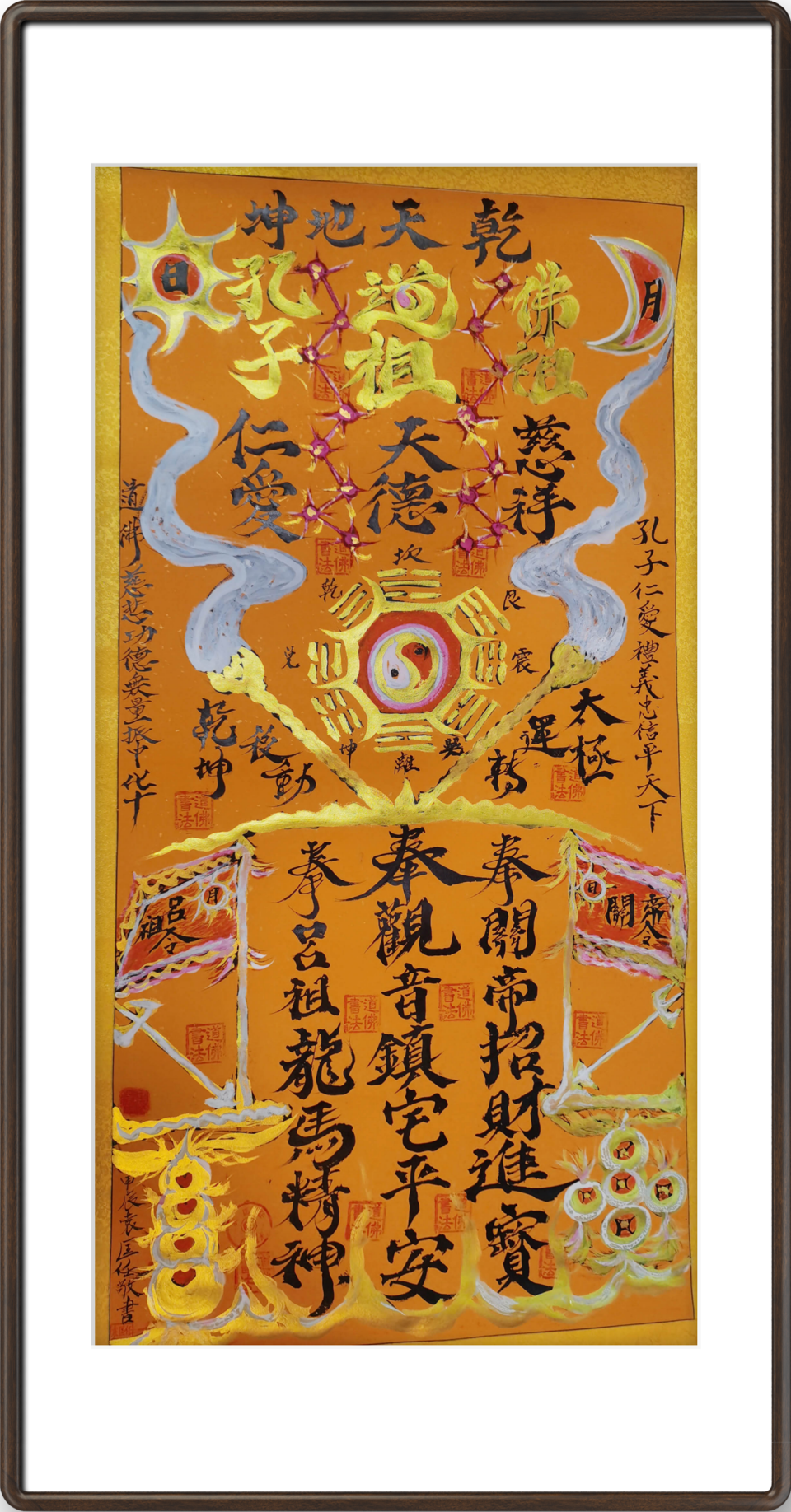 主要元素:日月星辰,冰峰,山河,海洋,旭日,紫气,神鹰,孔道佛,仁爱,慈祥,功德,长寿,养生,养心,关刀,拂尘,葫芦,金钱,金刚经,道德经,春秋经,周易,四书,五经,心经,关帝,观音,吕祖,道祖,佛祖,太极,乾坤,宇宙,北斗,八卦。莲花,莲藕,莲子,道笔,龙凤,镇宅,平安,驱魔僻邪,招财,进宝,生意兴隆,身体健康,财源滚滚,有求必应,天后,黄大仙,天道酬勤,海纳百川,神州,中华。卍,天地,老子,孔子,太上老君,道法自然,佛心,道心。