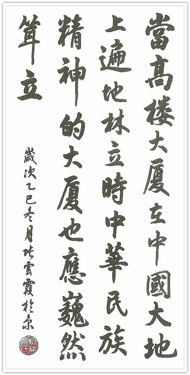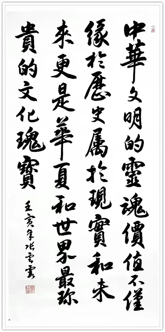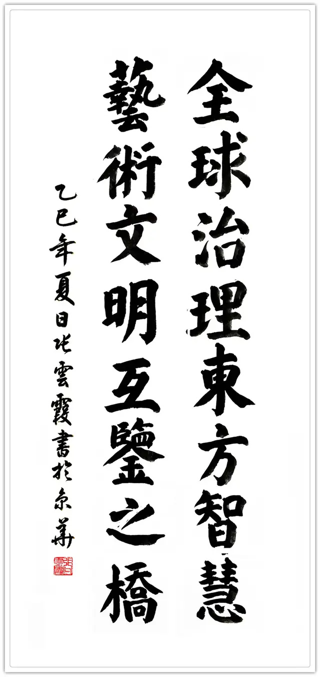 她的书法成就源于对颜真卿书风的深入研习与个人化创新。其书法以颜体为根基,作品透露出正大、雄浑的唐风气象,笔触沉稳,力透纸背。在传承中形成了鲜明的个人风格,被誉为“云霞风”。其特点是柔中带刚,在颜体的阳刚厚重之中,融入了女性书法家的婉润与典雅。她将太极的哲学与劲力融入笔法,追求自然流畅。擅长驾驭长篇巨制,曾合作创作70米长卷《黄河明珠三门峡》,展现了非凡的气魄与掌控力。