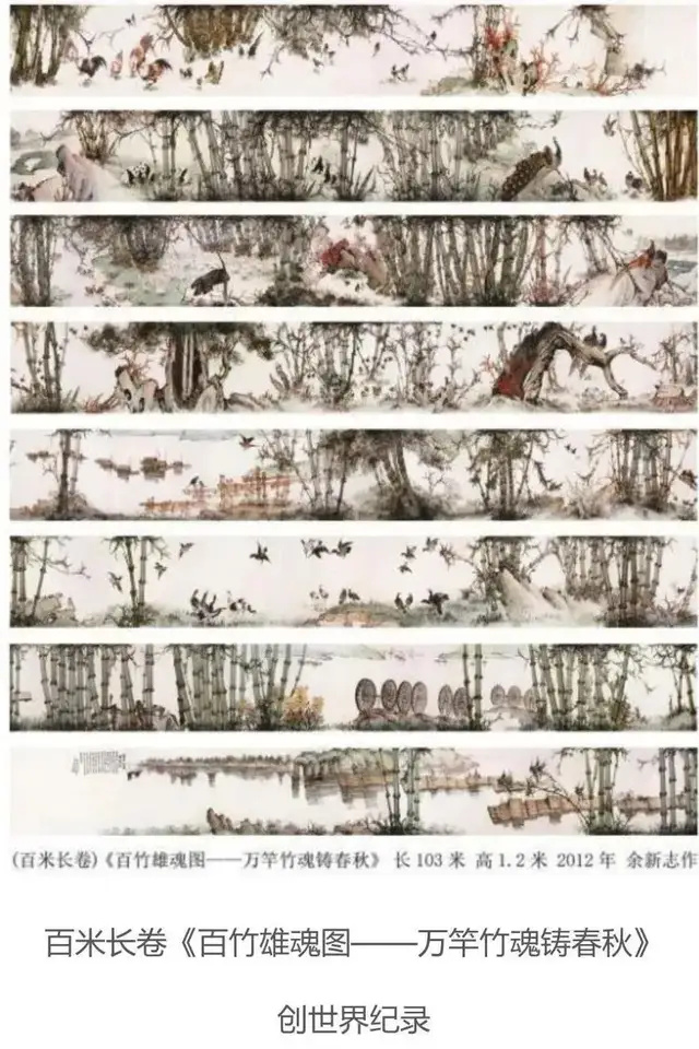 余老先生几十年来,走遍大江南北,全身心投入竹画写生创作,收集素材数千幅,终于在2012年创作完成了长103米、宽1.2米的百米长卷《百竹雄魂图——万竿竹魂铸春秋》,创下“画竹种类最多、最美的百米长卷”世界纪录,传承千秋。2016年百米长卷又被载入《中国国史》,为世人留下了不朽的竹画史料、宝贵财富,永载史册。从1993年以来,中国邮政总局先后为余新志先生出版珍藏纪念邮票三十余套,全球发行,传播文化。并先后出版发行余新志个人专著画集数百套。上百幅作品被国家博物馆、中国美术馆等国内外几百家艺术藏馆永久收藏陈列。其个人传略被载入《中国人物年鉴》《中国国史》《中国历代美术家名人大辞典》《世界人物辞海》等百余部辞书。余新志先生倾尽毕生心血,为弘扬中华民族优秀的传统文化作出了杰出贡献。