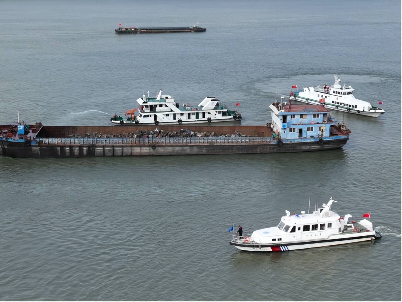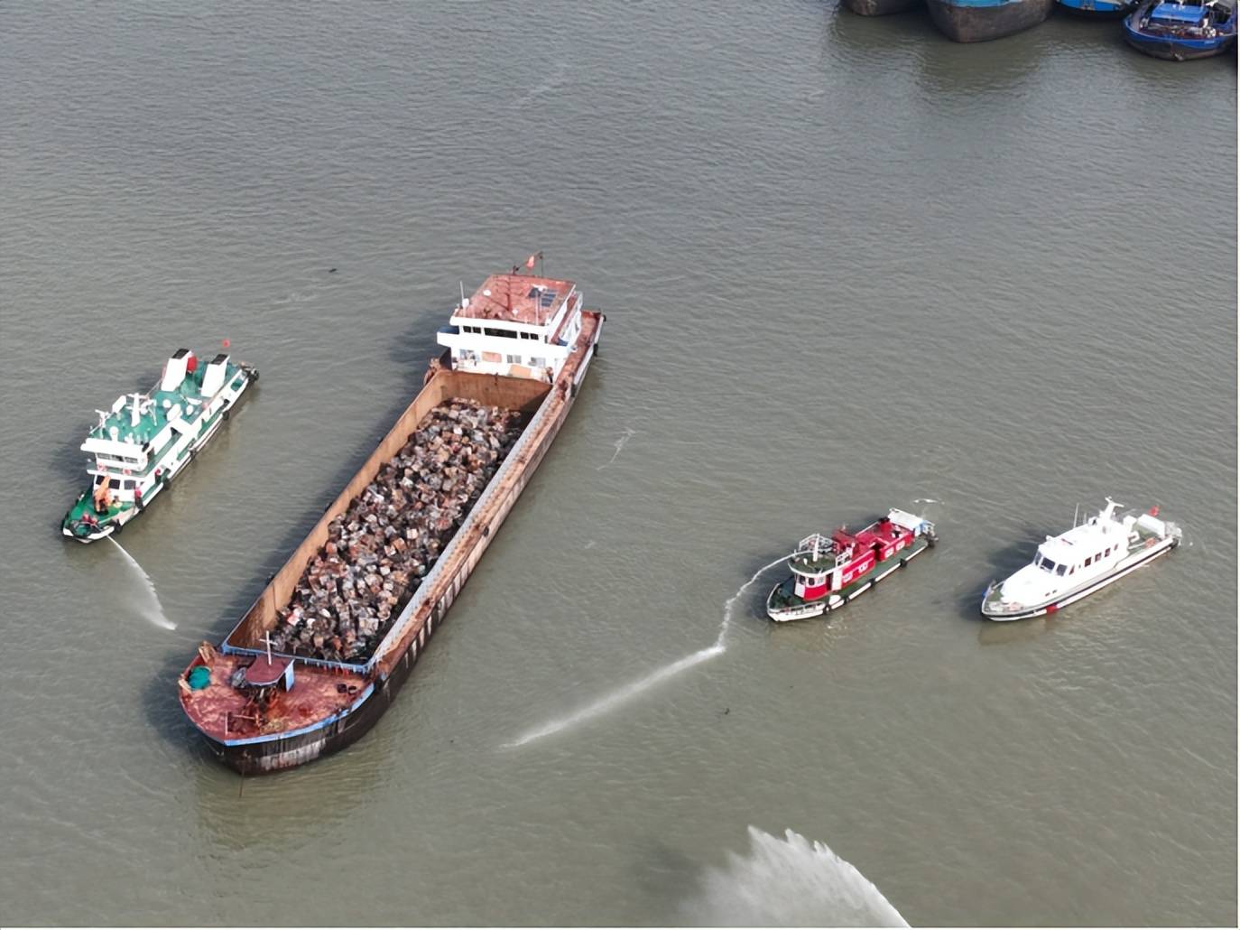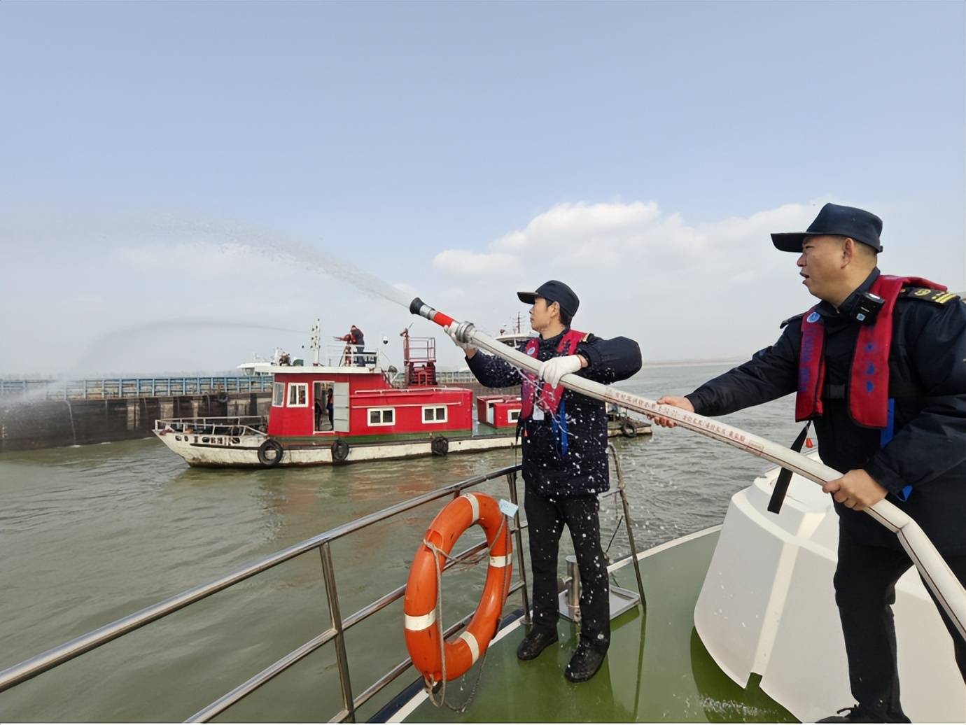 执法人员接警后第一时间应急响应,使用甚高频发布航行安全提示,提醒上下水船舶有序避让演习区域,根据现场指令,启动消防泵对准“着火点”实施精准扑救,快速控制“火势”,圆满完成预设科目的演习任务。