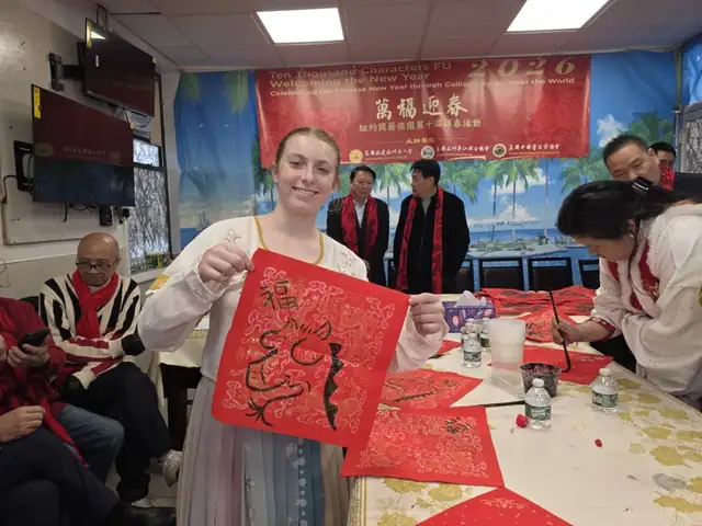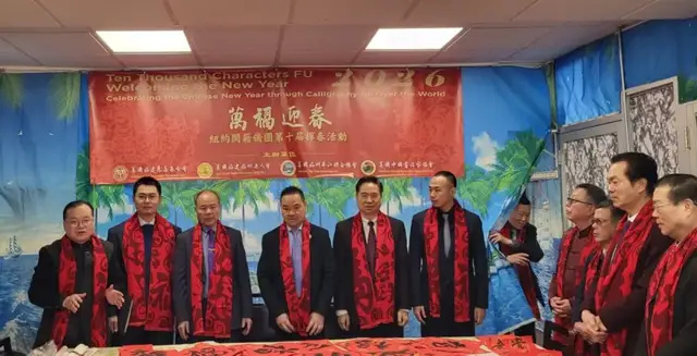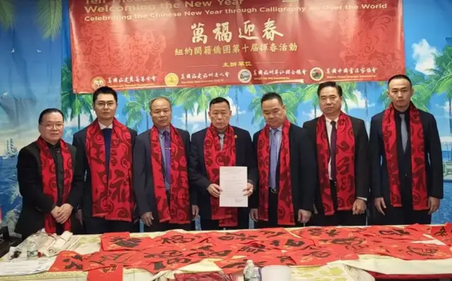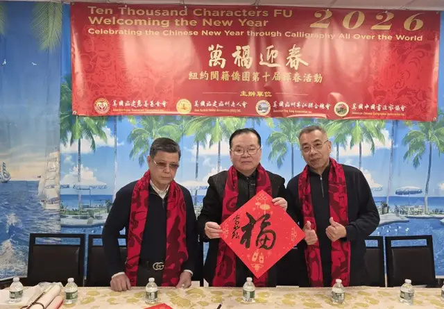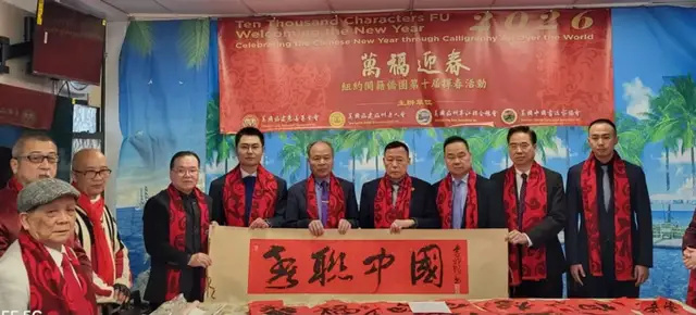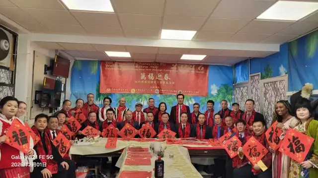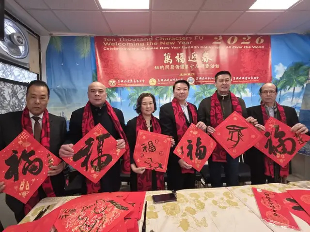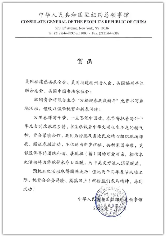 2月1日,为弘扬书法艺术,促进国际文化交流。由美国福建慈善基金会,美国福建福州老人会,美国福州亭江联合总会,美国中国书法家协会在纽华埠东百老汇街65号四层举办2026年“万福迎春.共庆新年"纽约闽籍侨团第十届为民众免费书写春联活动。参加今天活动有中国驻纽约总领馆领事向裕韬,荣顶,美国福建慈善基金会主席林德明,美国福建福州老人会主席郑敬桂,美国福州亭江联合总会主席林新,美国中国书法家协会主席李兆银,还有美国中国书法家协会张军,叶济民,郑子团,武福生,刘剑尘,武昌愚,李静雨,杨行,Arielle Roberts,Lucy Miller, Maggie (Meiqi) Ma多位书法家将现场挥毫,为社区民众书写春联,送上象征喜庆祥和的新春祝福。