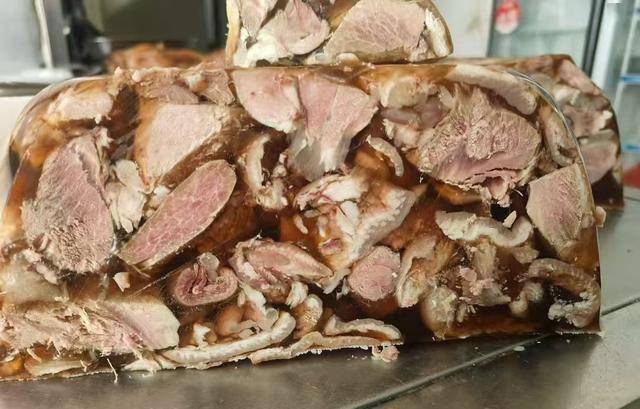与该店卤肉一脉相承,冻肉制作同样恪守严苛的选料标准与传统工艺流程:选用新鲜处理的猪头、猪皮、猪蹄、猪肘、猪尾等原料,搭配秘制调味料入锅炖煮,大火煮沸后转小火慢熬半小时,确保食材充分入味、胶质析出。