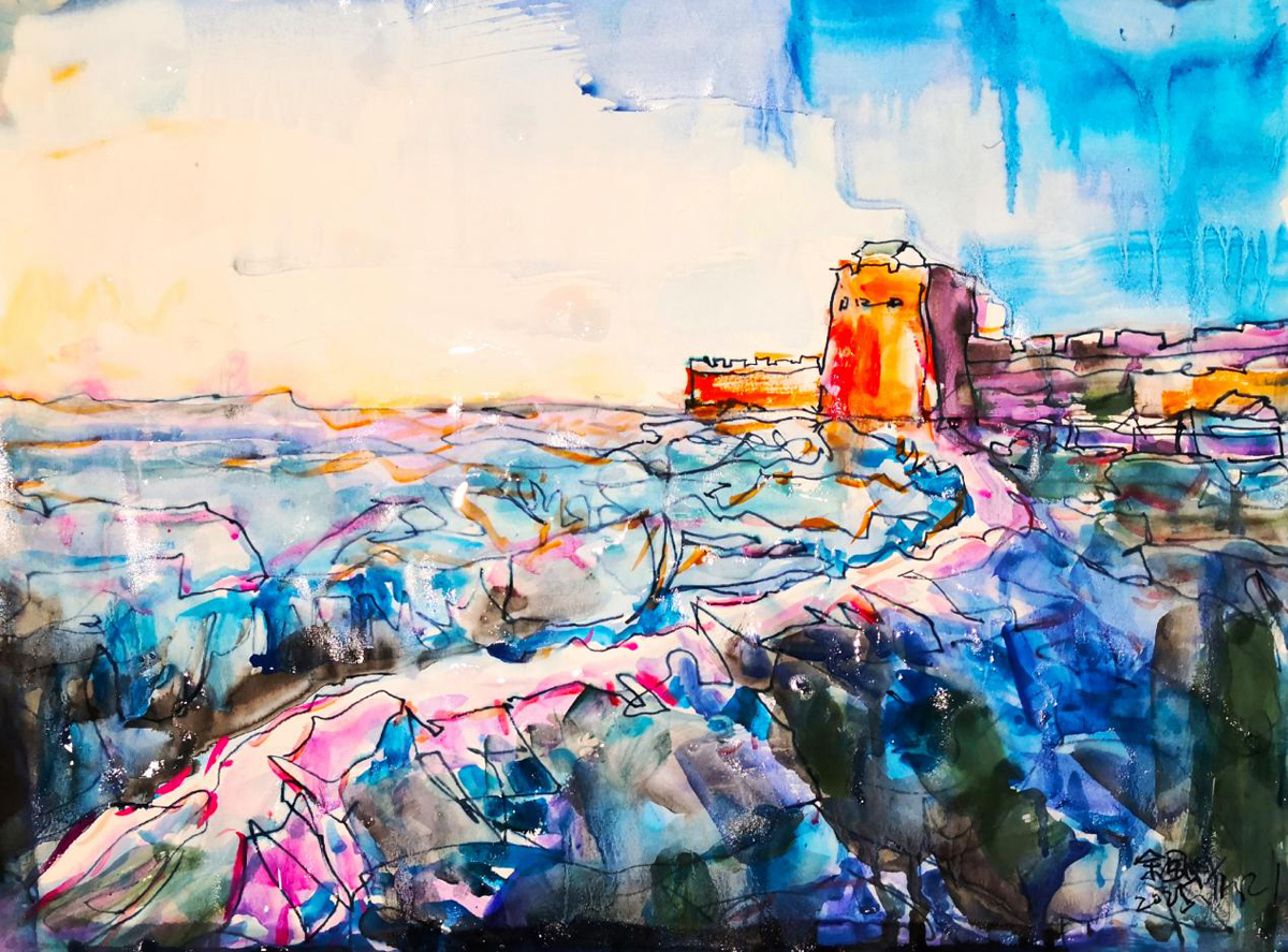 观余先生之长城画作,色彩如诗,灵动跳跃。那绚烂的色彩,似春日繁花绽放,又似秋日枫叶如火,巧妙地交织在一起,勾勒出长城的雄浑与壮美。或浓墨重彩,如激昂的乐章,奏响长城的磅礴气势;或轻描淡写,似悠扬的小调,诉说着长城的温婉柔情。每一抹色彩,都是他对长城深情的表达;每一处笔触,都是他心灵深处的悸动。