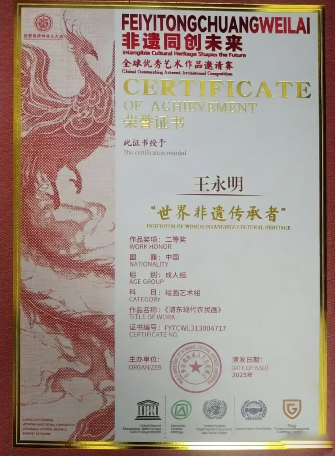美术评论家候林老师曾如此评价:"王永明的画是活着的地方志。他用农民的质朴、诗人的敏感、哲人的深邃,在宣纸上构筑起属于浦东的精神图腾。"其作品《一网鱼》被联合国教科文组织收藏,更印证了"越是民族的,越是世界的"艺术真理。