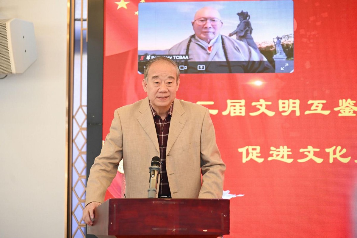 澳大利亚塔州中国佛教学院院长、澳洲中国和平统一促进会常务副会长、华夏文化促进会文化产业工作委员会副会长薄伽梵·智及维摩诘宗师通过视频连线发表主题演讲。宗师指出,佛教所倡导的“慈悲为怀”“和合共生”精神,与习近平主席提出的“人类命运共同体”理念高度契合。习主席强调:“文明因多样而交流,因交流而互鉴,因互鉴而发展。”这一论断深刻揭示了文明演进的内在规律,也为宗教文化参与全球对话提供了根本指引。宗师从“宇宙灵性观”的维度阐释:一切文明皆源于同一觉性本源,不同文化只是此一灵性在时空中的多元显化。真正的文明互鉴,不是表层的习俗交换,而是心灵深处的共鸣与觉醒。宗教作为文明的核心载体,应超越形式差异,以“各美其美,美人之美”的胸怀,促进不同信仰间的理解与尊重。唯有以慈悲化解对立,以智慧照见共性,以和合凝聚共识,方能夯实人类命运共同体的人文根基。宗师表示,将继续秉持这一使命,推动宗教文化在世界文明对话中发挥桥梁作用,为构建持久和平、共同繁荣的人类未来贡献东方智慧。其深邃洞见与坚定信念,赢得全场热烈掌声。