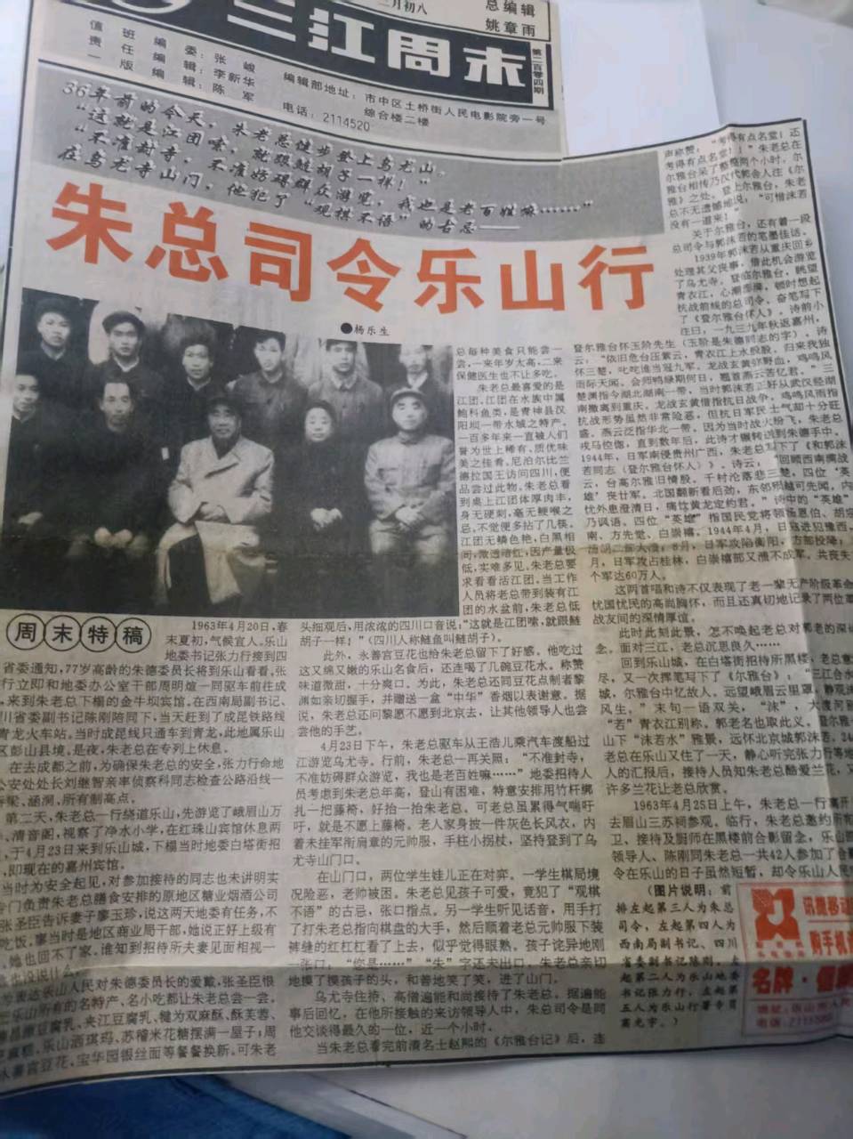 (此文原载1999年4月23日《乐山日报》头版头条“周末特稿”,后获2000年四川省报纸副刊奖。不知是天公作美,还是编辑有意为之,朱老总就是在三十六前同月同日视察乐山。)