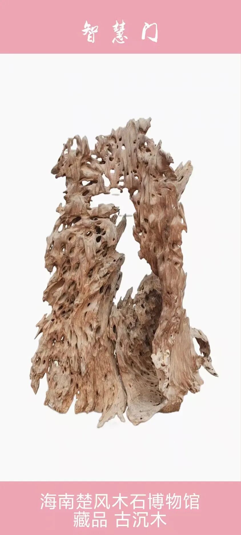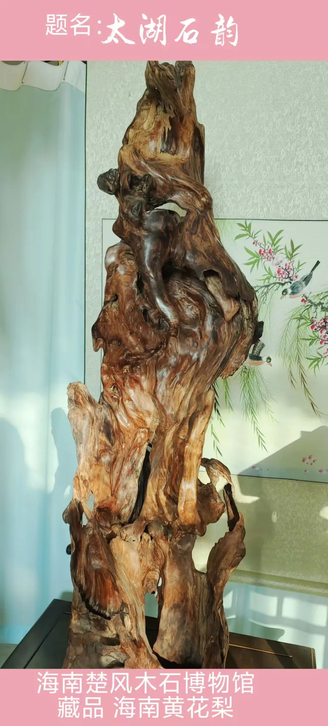 注:此海南黄花梨纯自然形态,未动一刀一斧,高130厘米,宽60厘米,重约50斤,有太湖石的皱透漏瘦,因而题名《太湖石韵》。