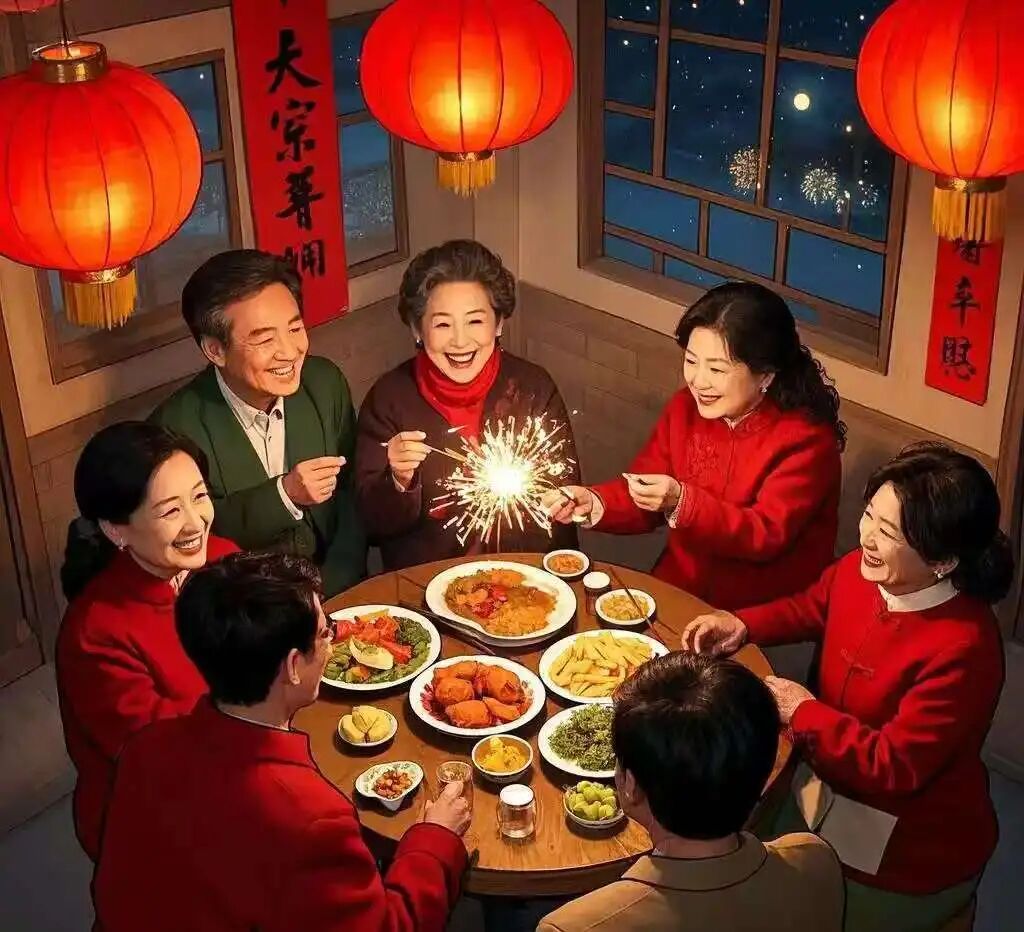 年夜饭是川西过年的重头戏,一桌菜摆满了八仙桌,腊肉香肠蒸得油亮,酥肉炸得金黄,腊味合蒸、豆豉鲮鱼、酥肉炖萝卜,还有奶奶拿手的甜烧白,夹沙肉糯糯的,裹着豆沙的甜,一点不腻。一家人围坐在一起,长辈们倒上白酒,孩子们捧着米酒,说说笑笑,窗外的爆竹声渐渐响起,噼里啪啦,映红了半边天。吃到一半,长辈们会给我们发压岁钱,红纸包着的零钱,攥在手里,心里乐开了花,那是儿时最珍贵的“财富”。