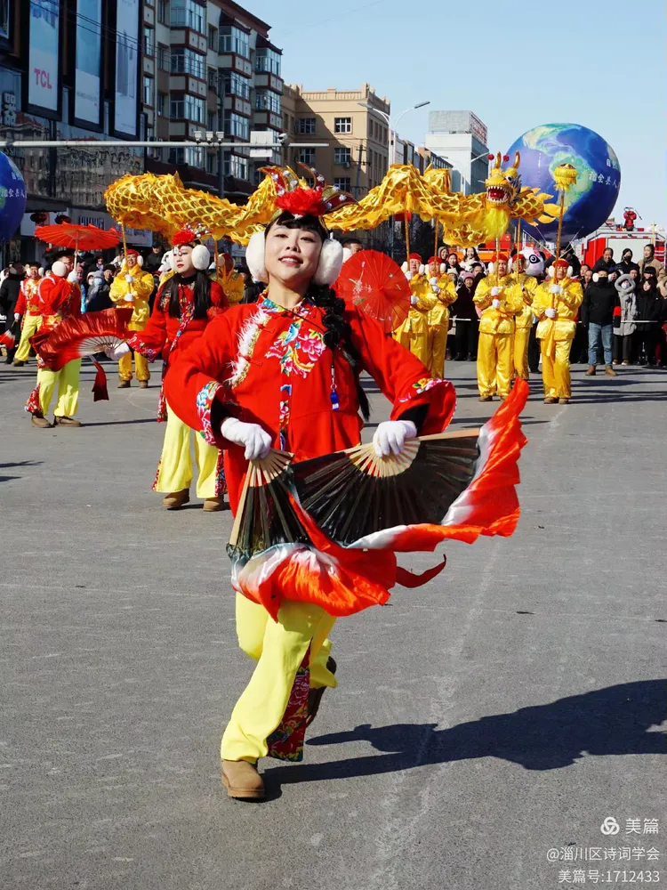 迎春锣鼓喧天,贺岁旌旗曳展。长街列阵风光艳,精彩纷呈耀眼。(带)马腾狮跃高跷炫,扇舞龙飞芯子悬,秧歌劲扭荡花船。民尽欢,同庆幸福年。