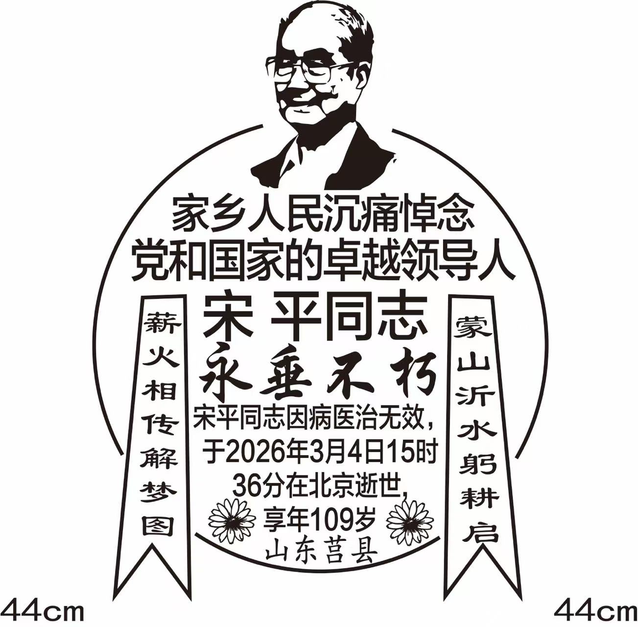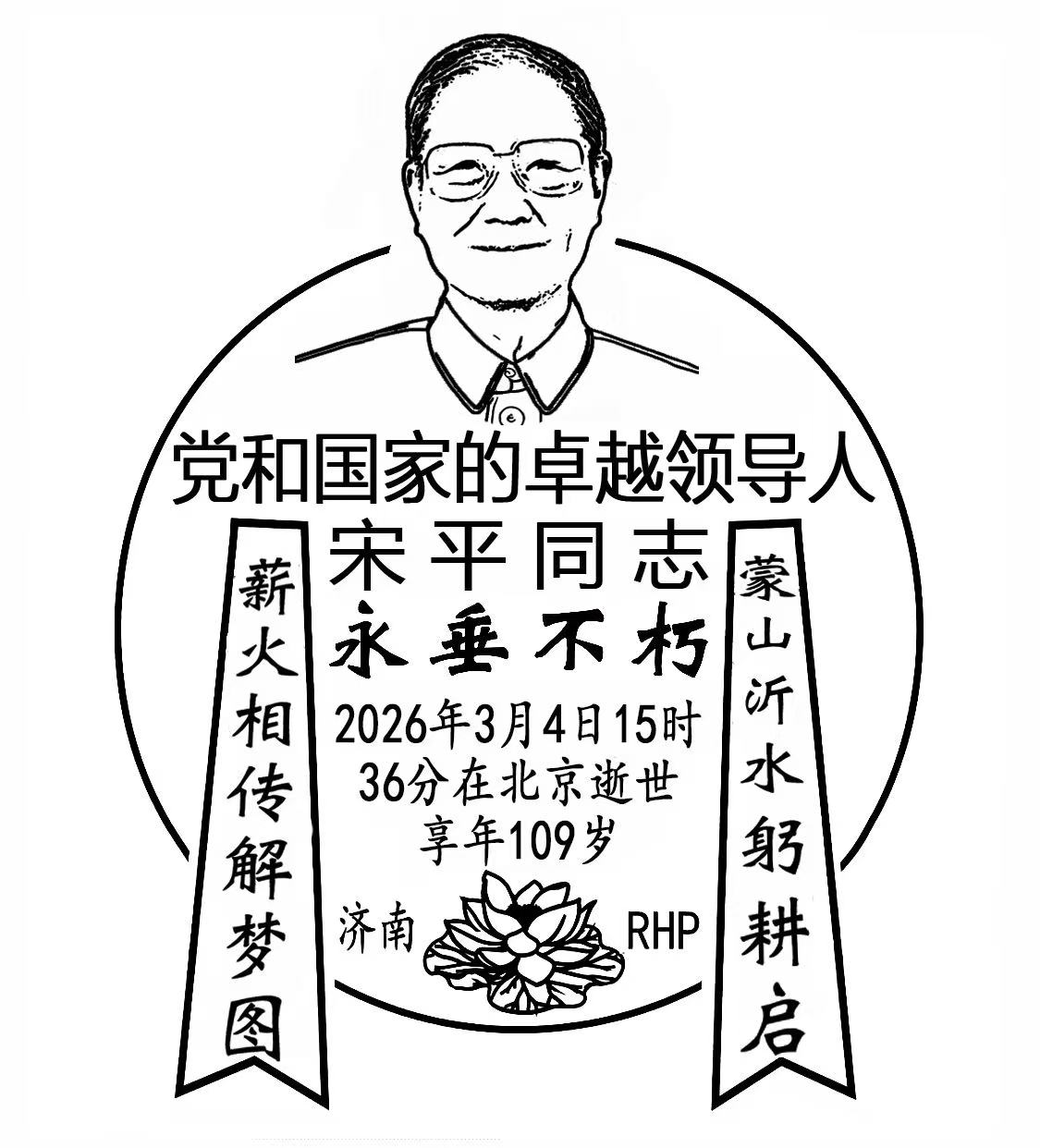 3月10日,在宋平遗体火化之日,家乡临沂以一枚纪念邮戳寄托哀思。纪念邮戳由济南邮品设计艺术家任怀平设计,著名文化学者丁再献以古老的东夷骨刻文字题写“蒙山沂水躬耕启,薪火相传解梦图”同时启用。这方寸之间的印记,不仅是哀悼,更是对一位世纪老人与故土血脉相连的深情回响。