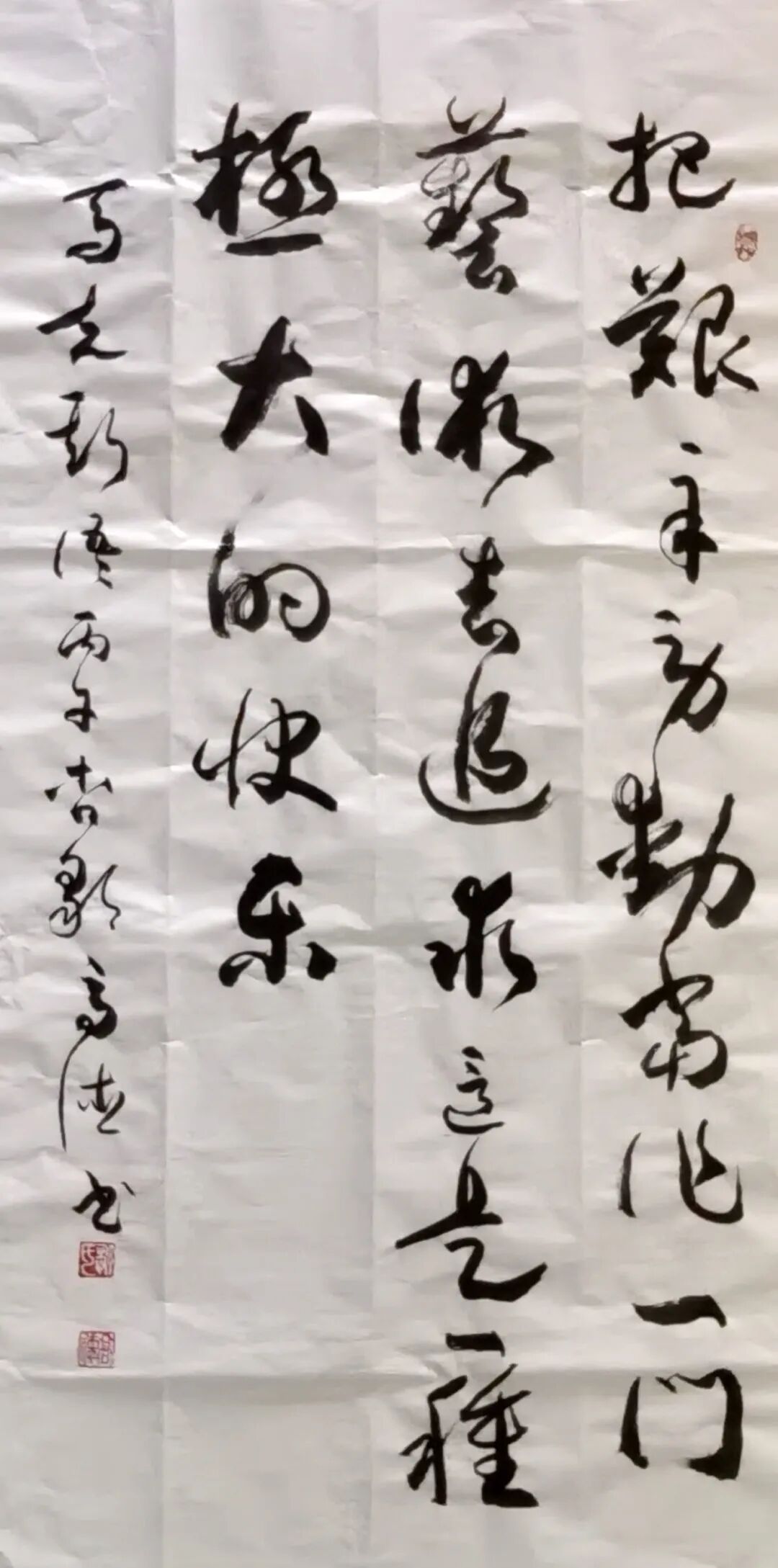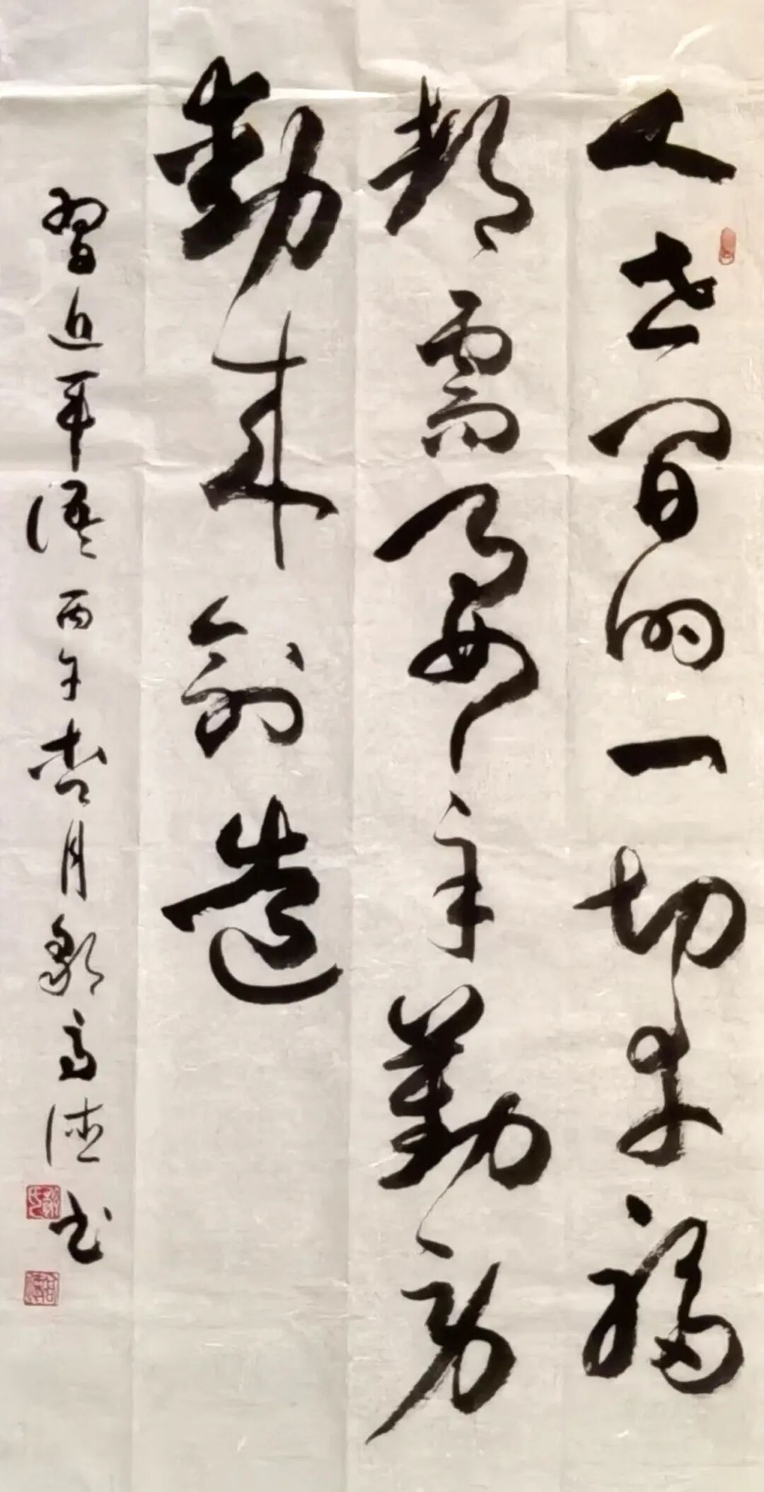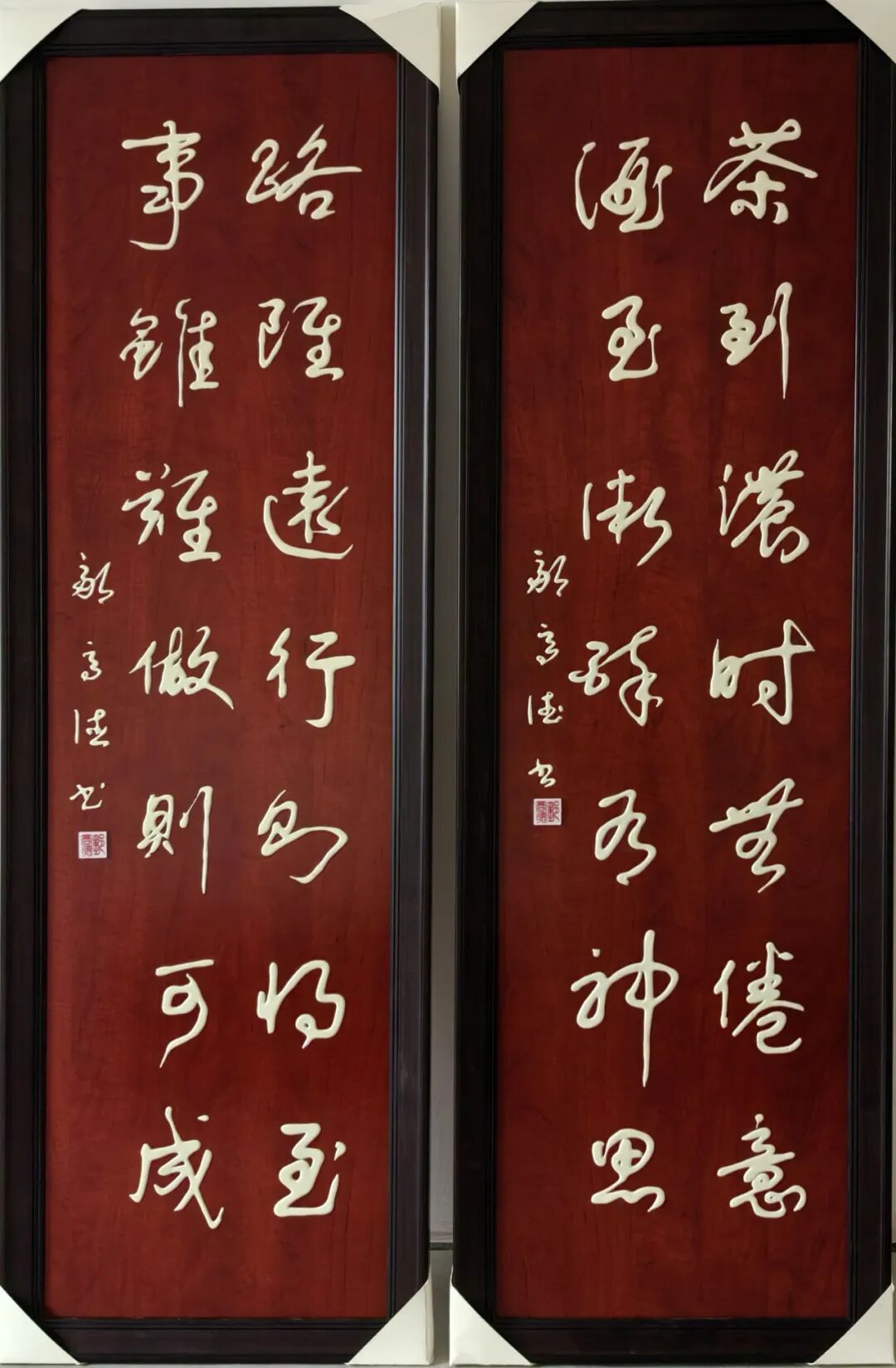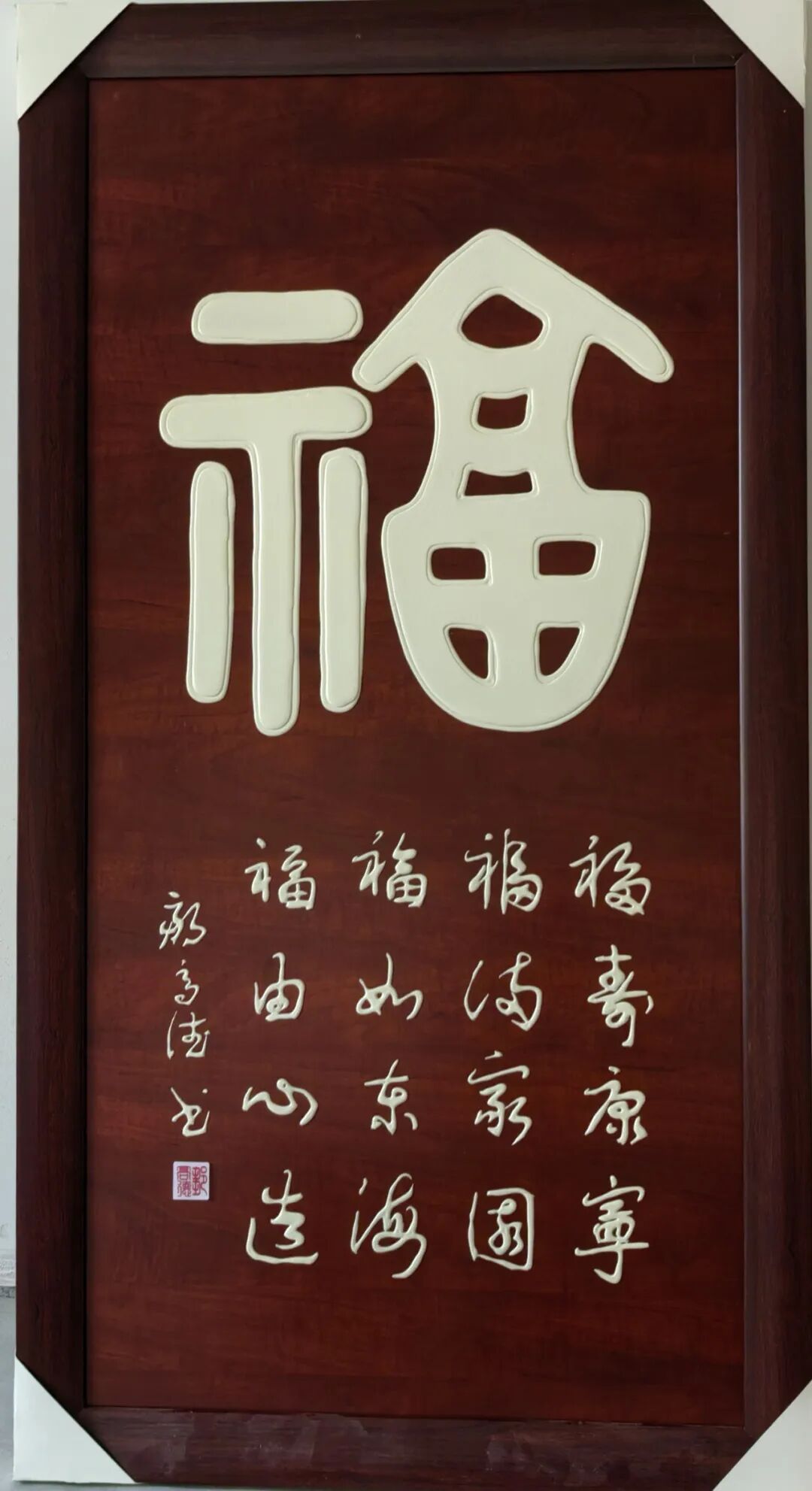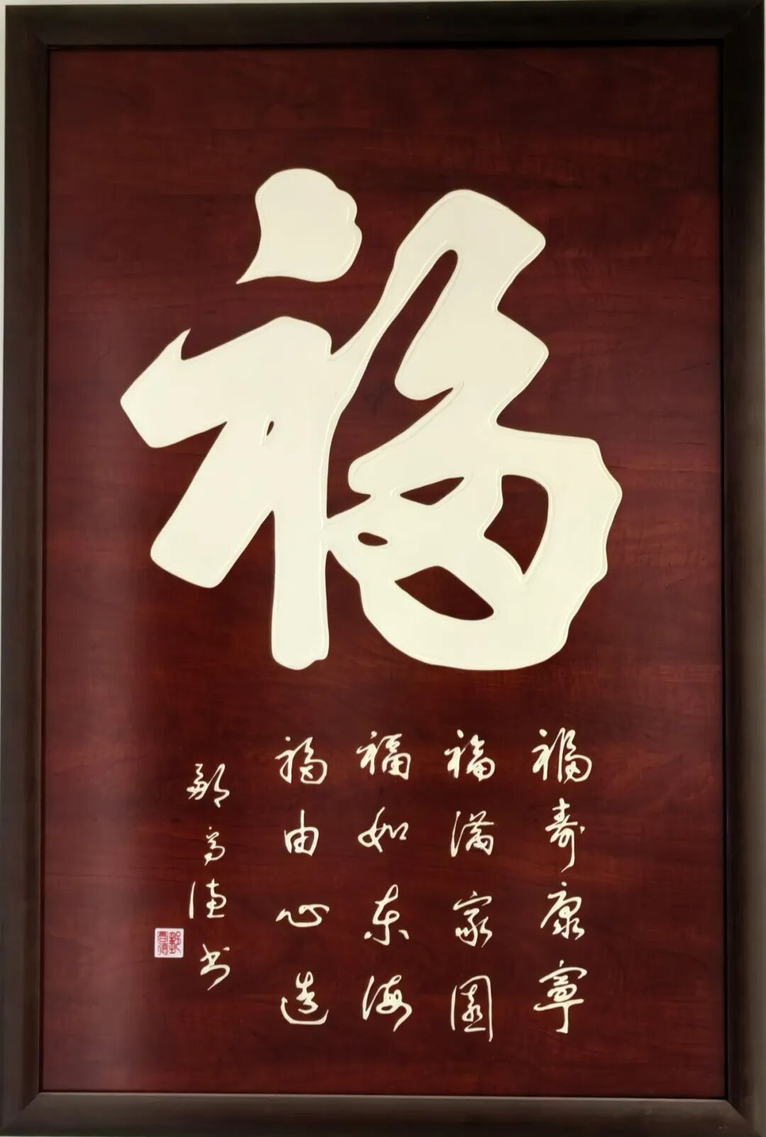 尤为可贵的是,邹高德先生坚守传统而不泥古,锐意创新而不离根,走出了独具特色的立体书法之路。他历经长期探索,独创板材立体书法技法,以特制膏料为墨,于板材之上书写出浮雕般的立体效果,突破传统宣纸的平面局限。其代表作《福》字中堂,立体饱满、温润如玉,造型端庄大气,既保留传统书法的笔墨神采,又兼具现代空间装饰的实用性与艺术美感。这种守正创新的探索,让传统书法以更鲜活的形式融入生活,也让其艺术风格在书坛独树一帜。