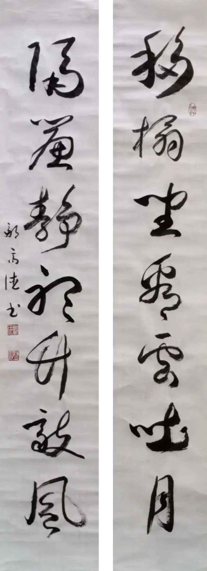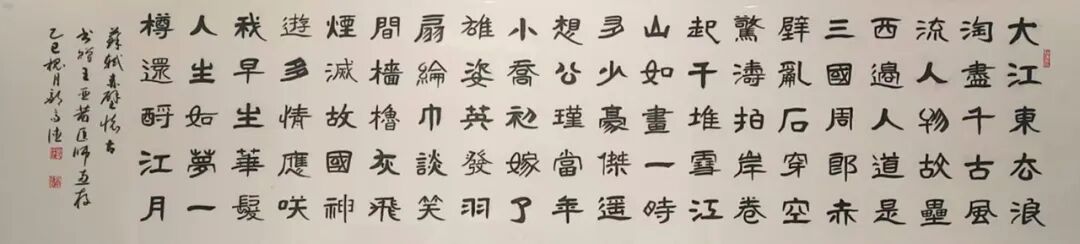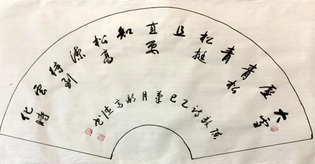在篆隶与行草创作上,邹高德先生同样兼具意趣与格调。其篆书《爱莲说》,线条圆劲古拙,结体雄浑大气,尽显大篆高古苍劲之美,与文章“出淤泥而不染”的高洁主旨相得益彰;隶书《咏马诗》,“蚕头燕尾”特征鲜明,波磔灵动舒展,笔画朴厚大气,古拙中藏灵动,尽显汉隶神韵。行草作品更是性情流露,对联“移榻坐看云吐月,隔帘静听竹敲风”,笔势舒展洒脱,墨色浓淡相宜,字形疏密有致,将文人雅趣与意境完美融合;扇面小品“康健为雅”,笔墨松弛有度,于方寸间见心境,于点画中见功力,展现出全面而成熟的书写驾驭能力。