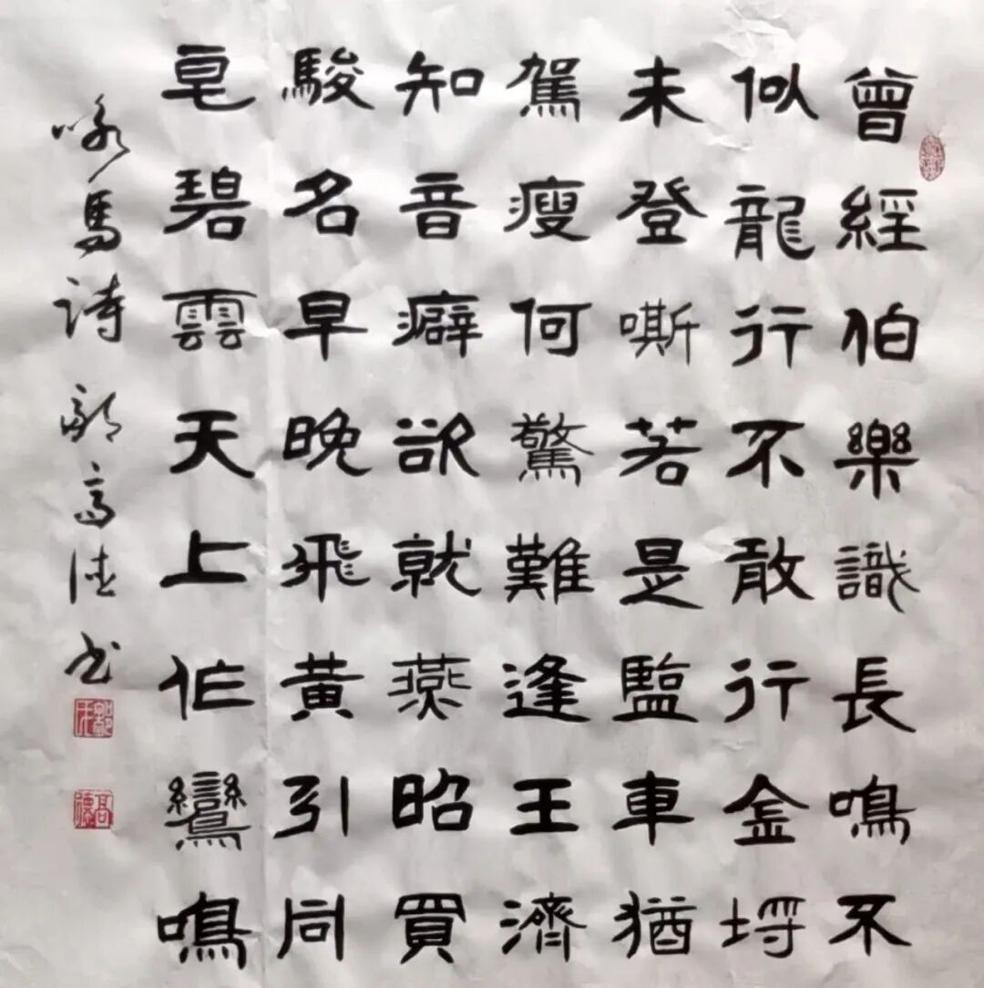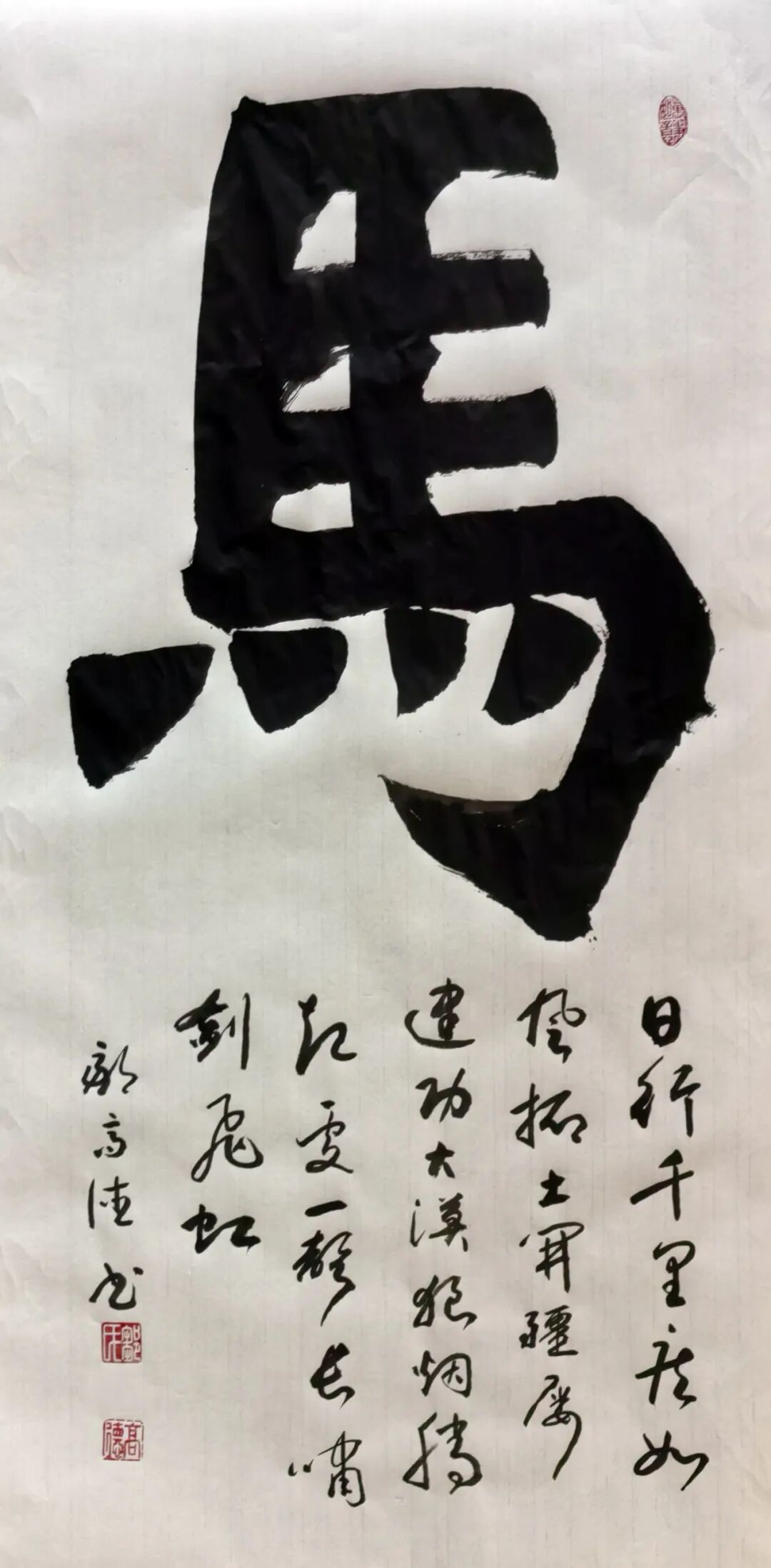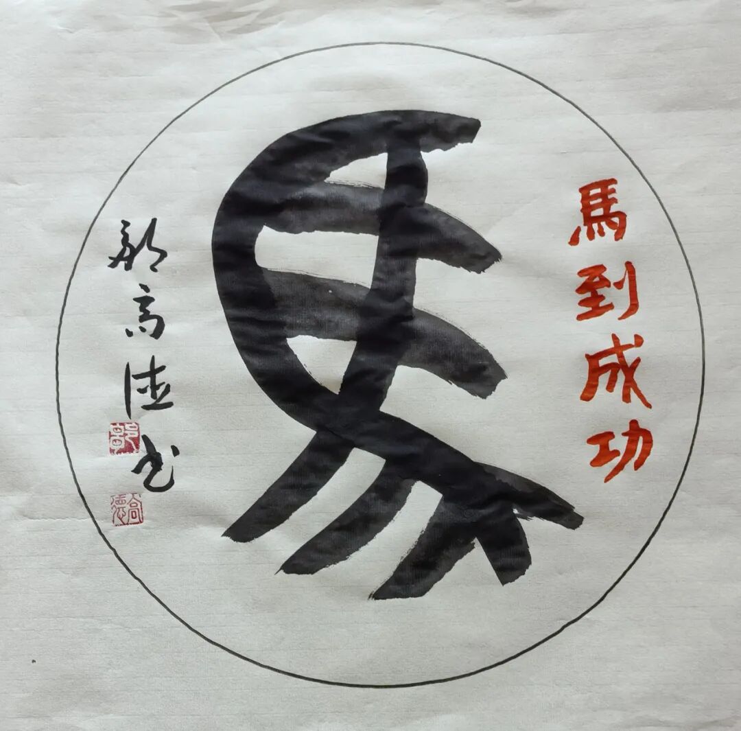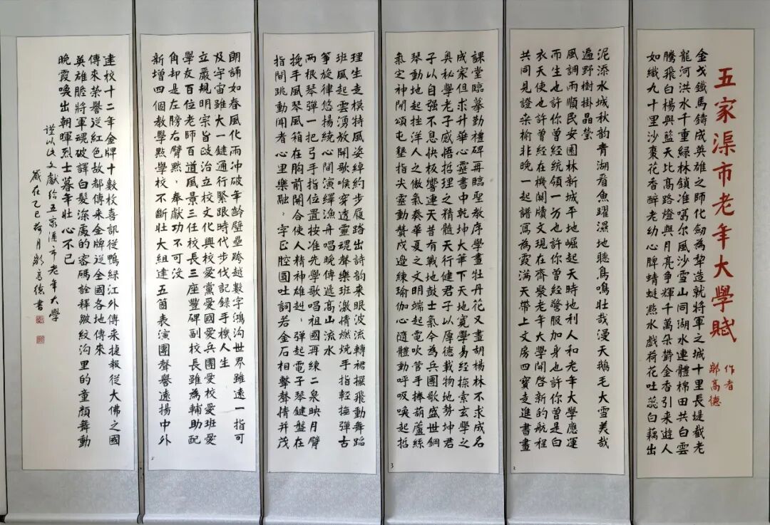 邹高德先生的书法,根基深厚、路子纯正,尤以楷书沉稳端严,最见功力与心性。其楷书取法唐楷宽博端庄之韵,兼融魏碑方劲刚健之骨,笔笔扎实落地,字字端庄规整,在严谨法度中蕴藏灵动生机。代表作《五家渠市老年大学赋》四条屏,通篇布局严整对称,线条劲挺饱满,结构开阔稳重,无丝毫矫饰之笔,亦无浮躁之气,将赋文的典雅厚重与楷书的庄重风骨完美相融,尽显中正大气的气象。其笔下榜书大字“馬”,更是气势开张、墨色酣畅,笔画雄健厚重,字形挺拔劲挺,凝骏马奔腾之势于笔端;下方行书题跋灵动流转,与大字刚柔相济、章法和谐,足见其对笔墨力度、章法布局的纯熟掌控。