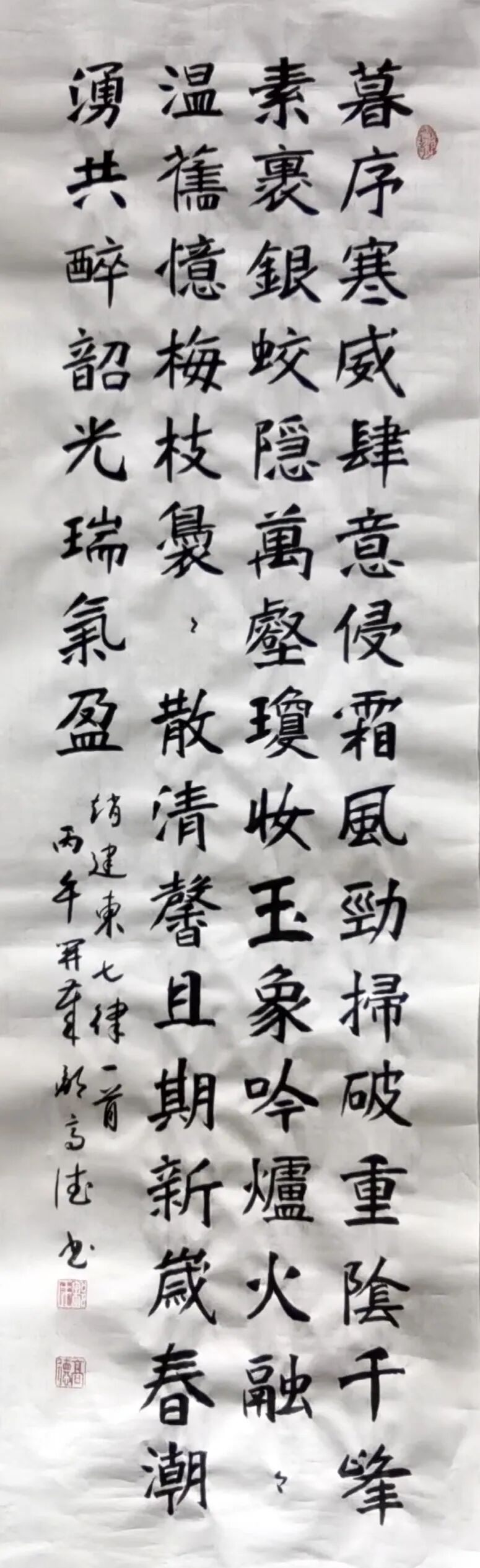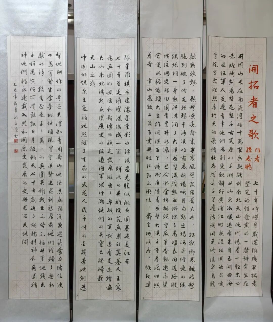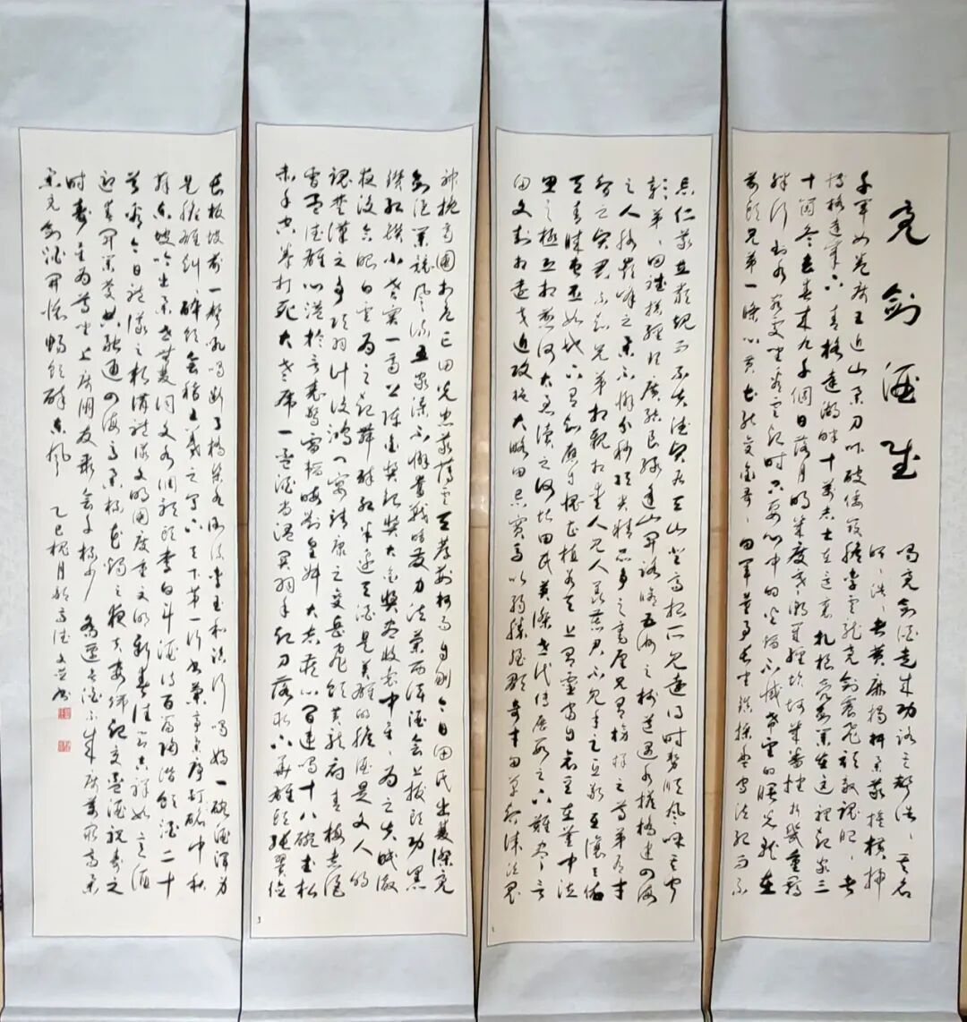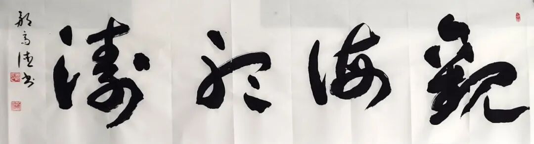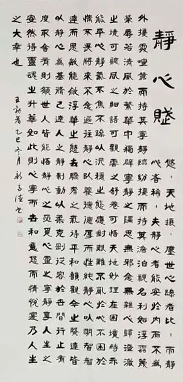 邹高德先生的书法,根基深厚、路子纯正,尤以楷书沉稳端严,最见功力与心性。其楷书取法唐楷宽博端庄之韵,兼融魏碑方劲刚健之骨,笔笔扎实落地,字字端庄规整,在严谨法度中蕴藏灵动生机。代表作《五家渠市老年大学赋》四条屏,通篇布局严整对称,线条劲挺饱满,结构开阔稳重,无丝毫矫饰之笔,亦无浮躁之气,将赋文的典雅厚重与楷书的庄重风骨完美相融,尽显中正大气的气象。其笔下榜书大字“馬”,更是气势开张、墨色酣畅,笔画雄健厚重,字形挺拔劲挺,凝骏马奔腾之势于笔端;下方行书题跋灵动流转,与大字刚柔相济、章法和谐,足见其对笔墨力度、章法布局的纯熟掌控。