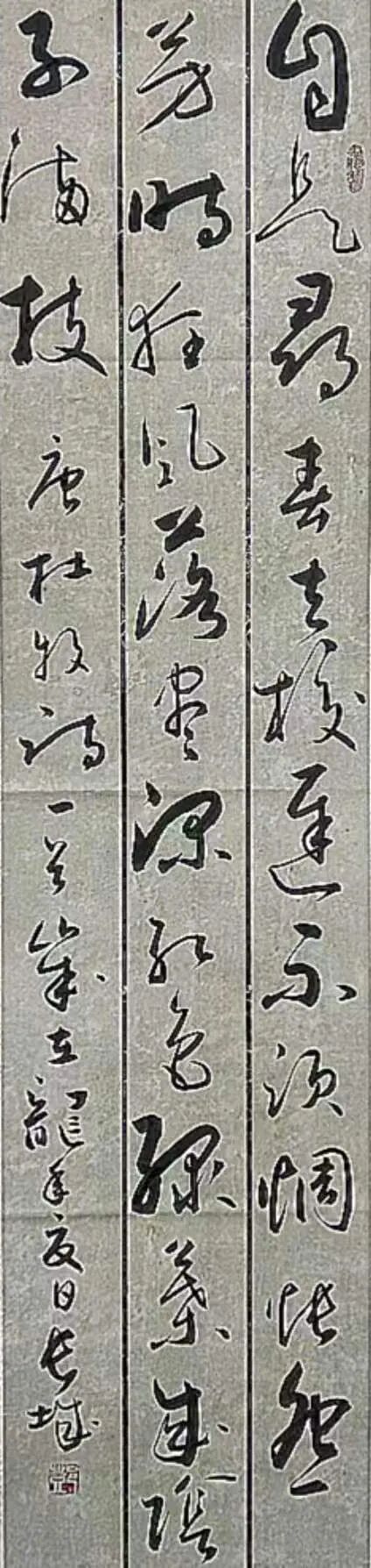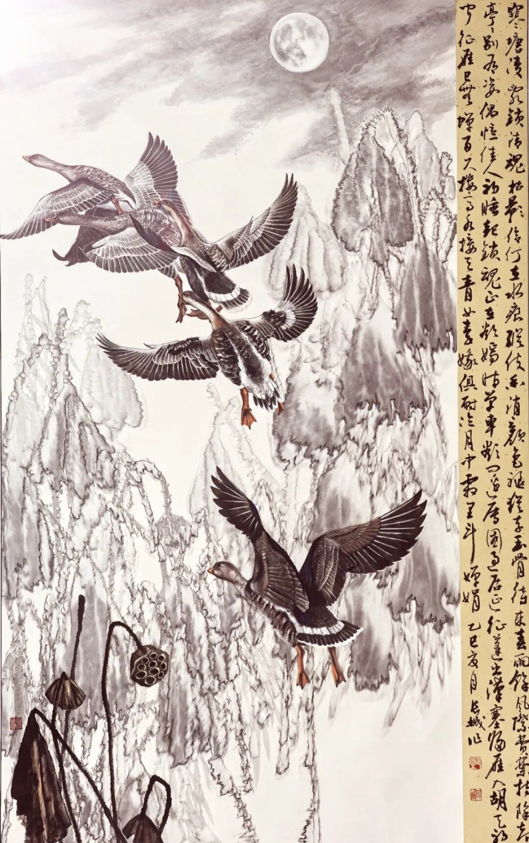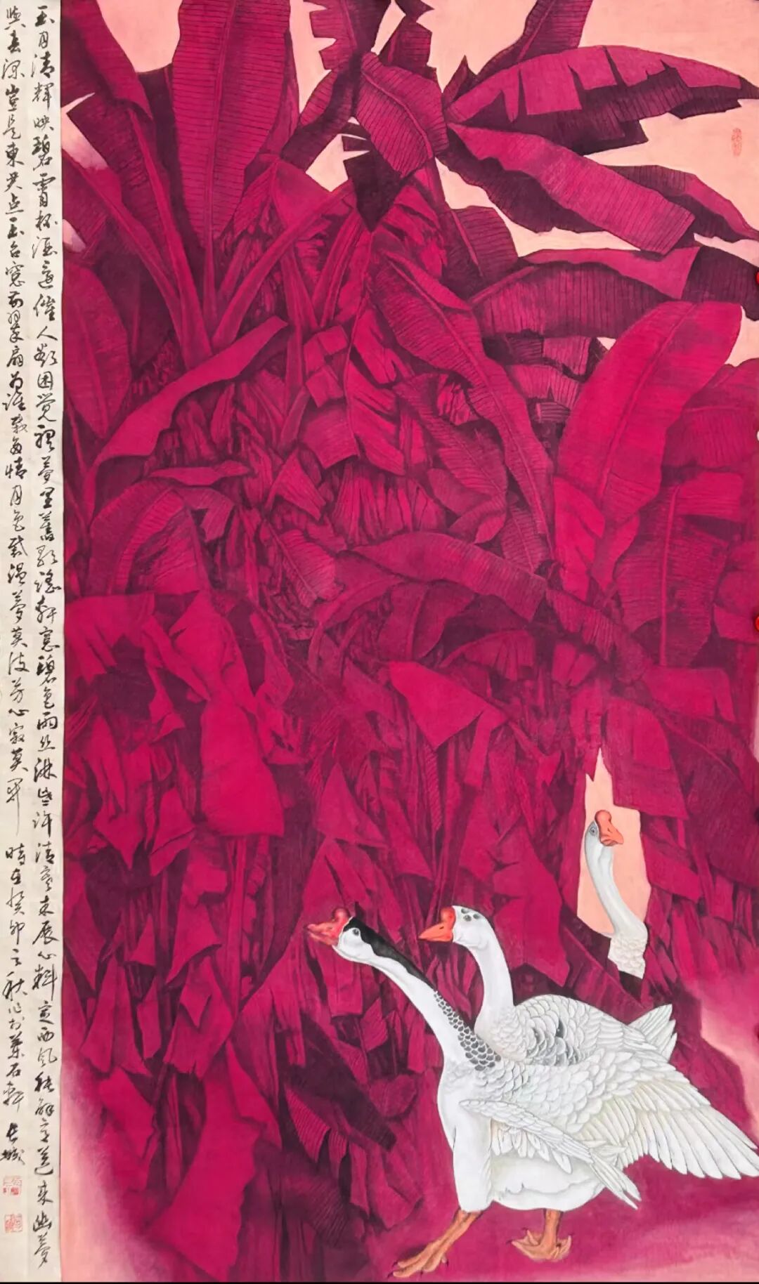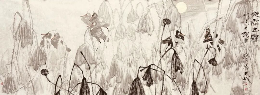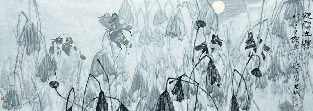 得笔法者写意正宗,可以夺物象之精神,也可以掠物象之体貌,果然真实不虚!观赏邓长城先生的绘画作品,无论是龙梅铿锵,还是荷池磅礴,或是南国榕根的丰姿多神,都画得极具精气神。浓墨作,容易污浊粗糙,也容易搞得层次不易分辨,糊涂一片,是为俗。但是观赏邓长城先生的绘画作品,用墨相当沉着,大墨铺陈,游刃有余,善用水,把墨调整出浓淡干湿焦五彩焕,层次分明,质如钢打铁铸,也有细心收拾的臻妙。再渲染以重彩与大墨顾映,让他的画尽有浑然浩莽的时代气象,画以畅志,莫不如此!画得好,并且画得妙,这就是邓先生的丹青作品有专业品质,有欣赏魅力的重要资粮!浓墨重彩赋盛世,铁点银钩写精神。赵子昂有论,写竹还需八法通,书画同源是共识,也是文人修养的必需。邓先生画得精彩,书法也写得不俗,诸书皆涉,尤其善写铁点银钩,高低有趣的行草,执笔写万类之象,快如惊墨驰电,慢作落花飞雪。墨池飞出北溟鱼,笔锋杀尽中山兔,此等翰墨,恰是书法状如虬龙蜿蜒的经典。古来书道,尽皆如是!所以邓先生既得书法,亦悟书道,技高一筹,真实不虚!