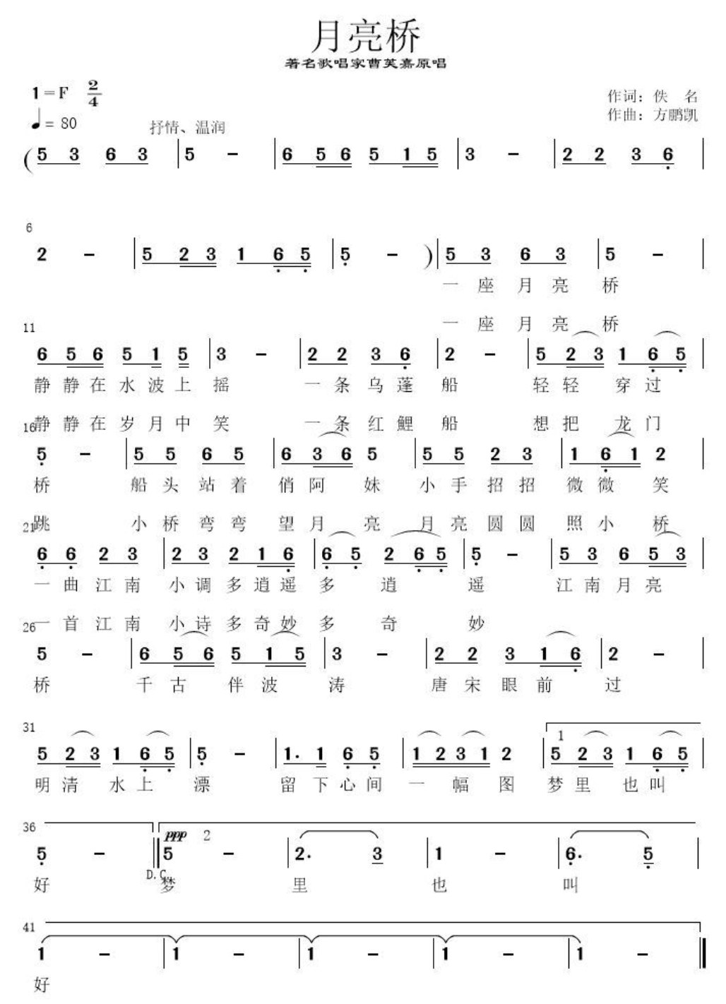 在音乐创作上,方鹏凯以婉转清丽的旋律呼应歌词的古典意境,五声音阶的运用与节奏上的轻摇感,模拟出水波荡漾、舟行桥下的灵动画面。整首作品结构精巧,前后呼应,既保留了民间小调的韵味,又通过艺术化的编排增强了抒情的感染力。