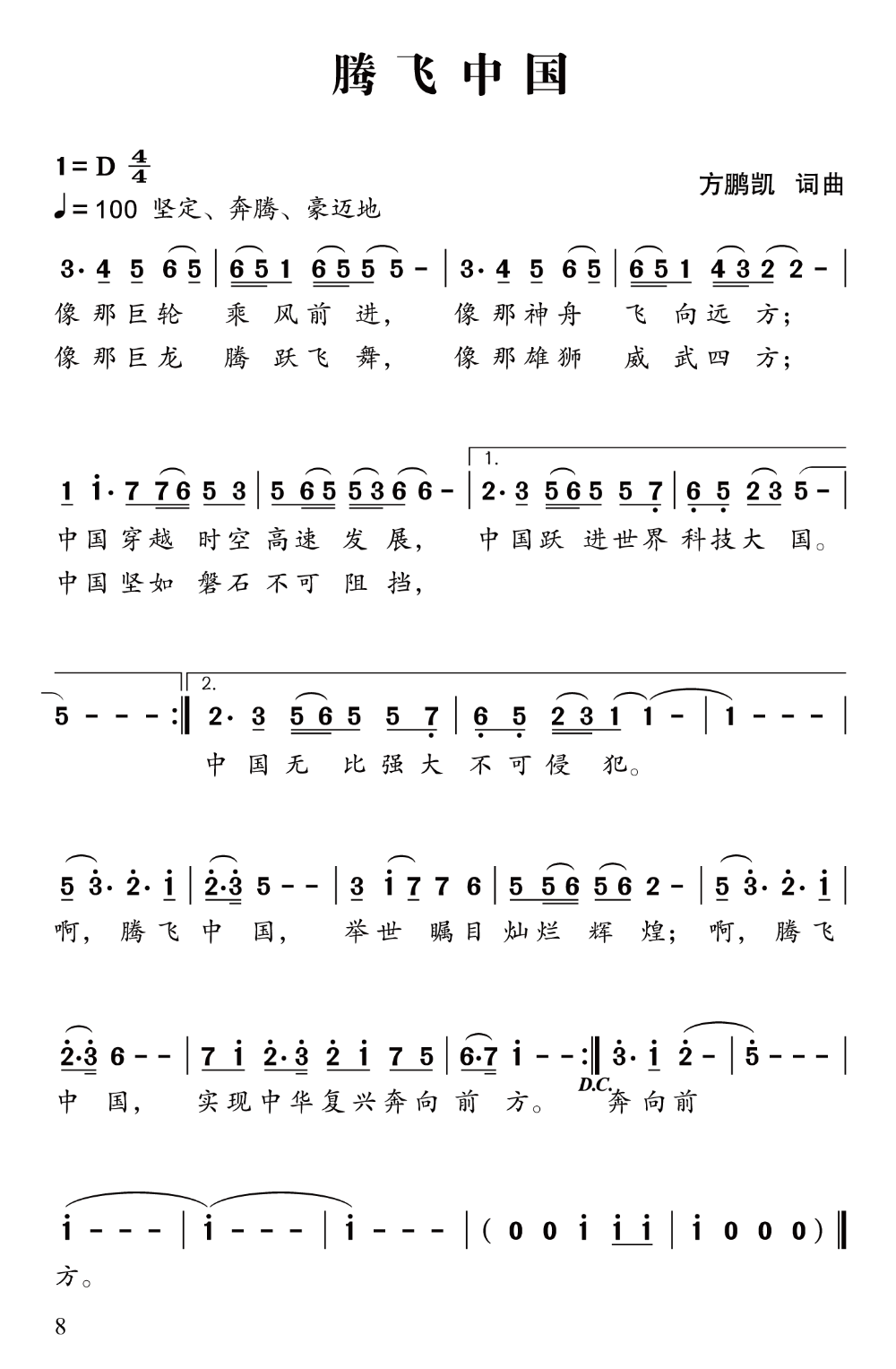 《腾飞中国》是一首以时代强音礼赞发展成就、展望复兴前景的颂歌。作品紧扣“腾飞”这一核心意象,以磅礴的比喻群——“巨轮乘风”“神舟飞天”“巨龙飞舞”“雄狮威震”,构建起多维度的国家形象图谱,生动展现了新时代中国在改革发展、科技创新、国际地位与国防实力等方面的全面飞跃。