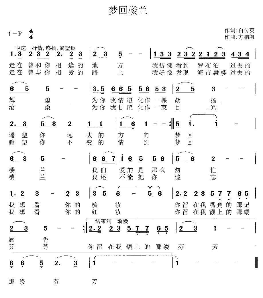 本曲是以传说中汉朝东陲楼兰古国的辉煌作为题材,回眸跨越了数千年时空的变化再现出当时楼兰国雄辉壮丽海市蜃楼的恢宏情景,别有新意,让人深有感触。歌词突现了作者似如深临其境以拟人化情感叙述性的写法,尤显优美感人,引人入胜。音乐伴奏引入桑巴鼓点仿佛衬托出古代久远骆驼行走的蹄子声在传递欢歌飞舞的场面,令人向往。旋律极具恰似想像力从远古飘来的天籁之音,通过独特难得的男中音歌星浑厚声音淋淋尽致慢缓缓悠扬的演绎,曼妙声声入耳。