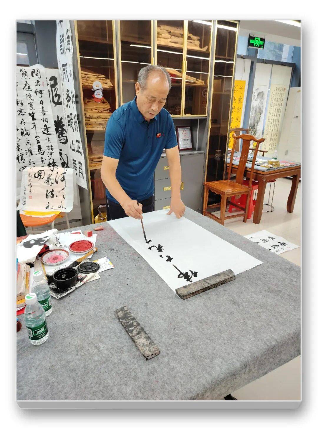 几十年来,他始终坚持“勤学苦练、刻苦钻研”的初心,笔耕不辍,从未停歇。他广泛涉猎历代名家碑帖,博采众长,既深入钻研楷书的法度严谨,又潜心领悟行草书的灵动洒脱,从柳公权、欧阳询的楷书,到王羲之、孙过庭的行草,再到历代其他名家的作品,他都一一揣摩,取其精华、去其糟粕,虚心学习他人之长,补己之短。他不急于求成,不追逐浮华,始终保持低调谦逊的态度,“低调做人,用心写字”,在笔墨的世界里默默耕耘,在日复一日的练习中打磨技艺、提升境界。这种不骄不躁、潜心修行的态度,不仅成就了他的书法技艺,更彰显了他高尚的人格修为。