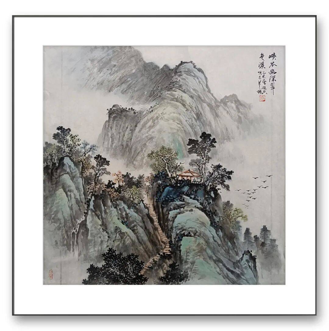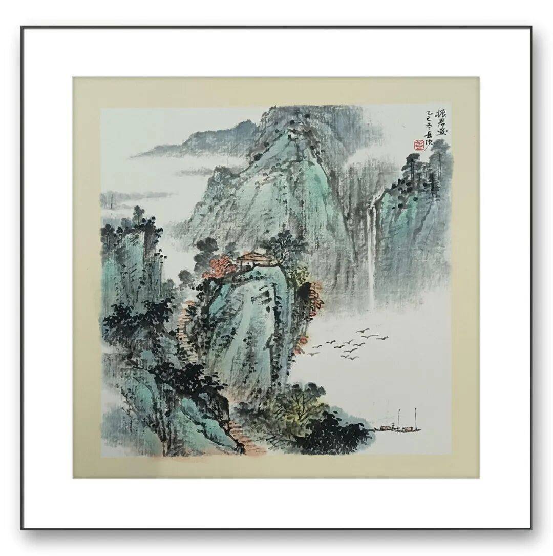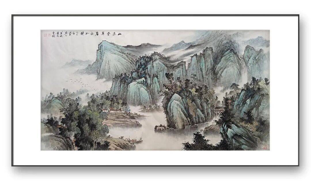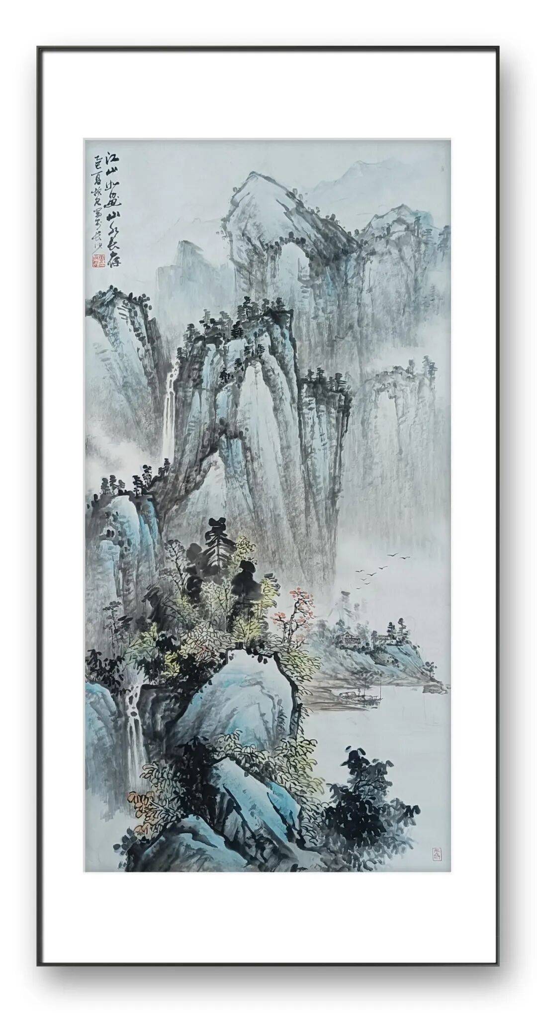 其次,作品意境蕴含着“天人合一”的人文情怀。唐振君先生将人文景观融入自然山水,亭台楼阁、舟桥屋舍的点缀,让山水不再是纯粹的自然景观,而是成为承载人文情感的空间。亭台立于山巅,石阶蜿蜒而上,似有人凭栏远眺,与自然相融共生;水岸屋舍错落,渔舟静泊水面,尽显田园牧歌式的生活气息。这些人文意象的植入,既延续了传统山水画“可游可居”的审美追求,又传递出人与自然和谐共生的当代理念,让山水作品超越了视觉审美,具备了精神抚慰的力量。