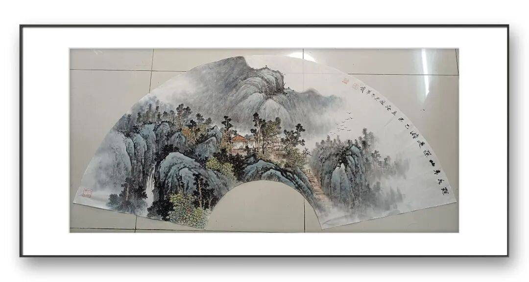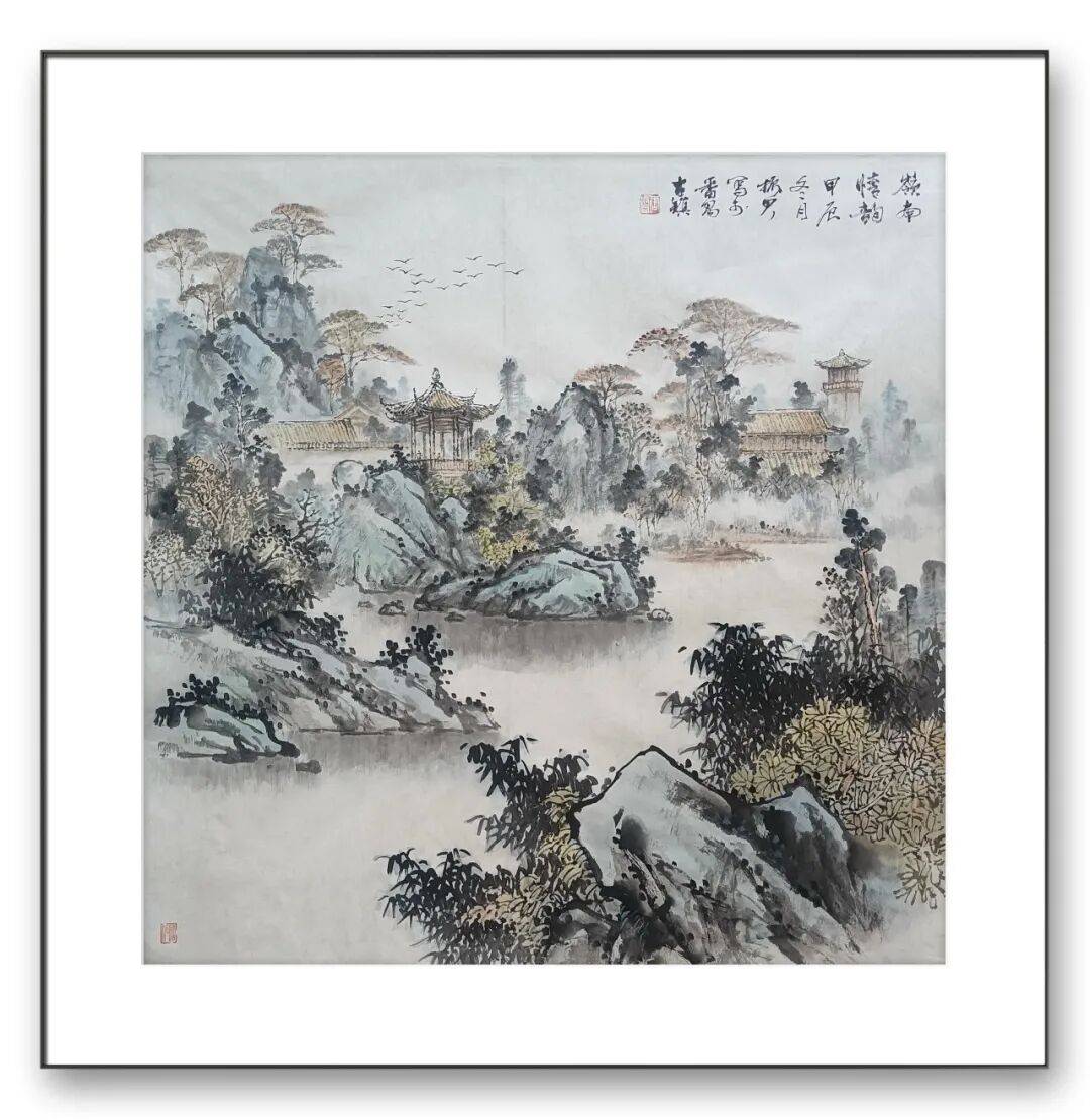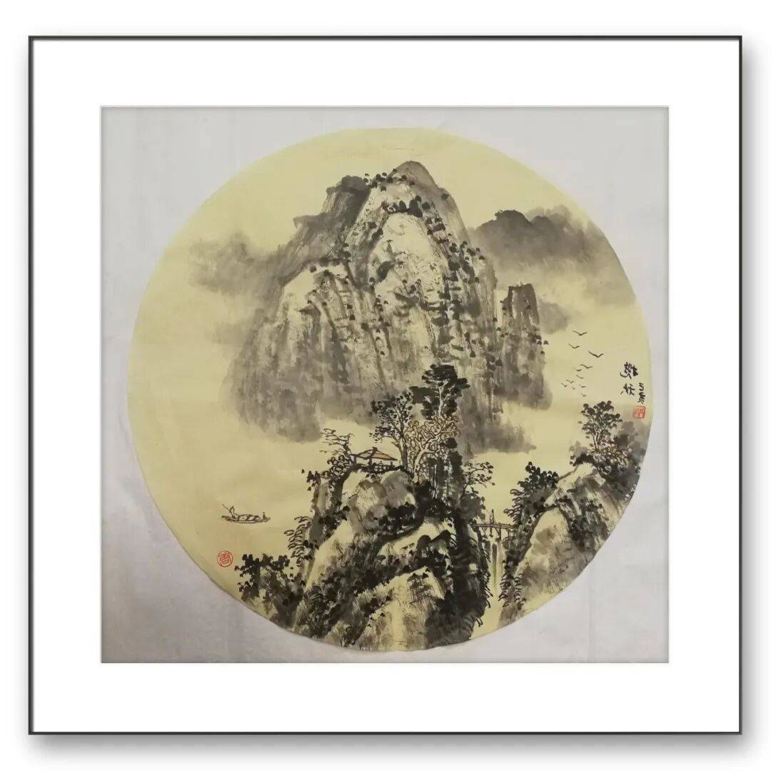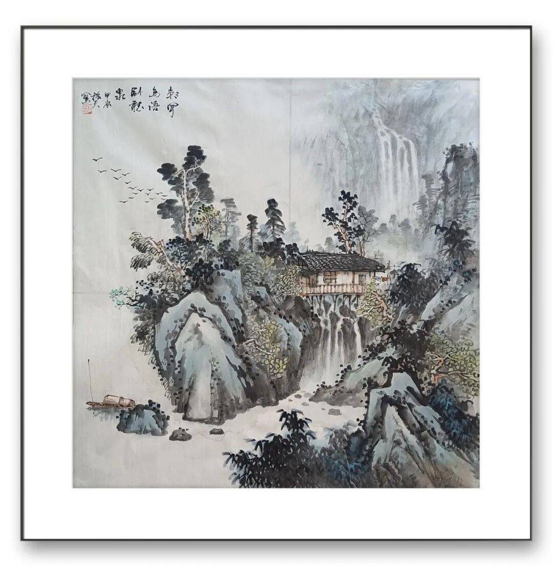 其次,作品意境蕴含着“天人合一”的人文情怀。唐振君先生将人文景观融入自然山水,亭台楼阁、舟桥屋舍的点缀,让山水不再是纯粹的自然景观,而是成为承载人文情感的空间。亭台立于山巅,石阶蜿蜒而上,似有人凭栏远眺,与自然相融共生;水岸屋舍错落,渔舟静泊水面,尽显田园牧歌式的生活气息。这些人文意象的植入,既延续了传统山水画“可游可居”的审美追求,又传递出人与自然和谐共生的当代理念,让山水作品超越了视觉审美,具备了精神抚慰的力量。