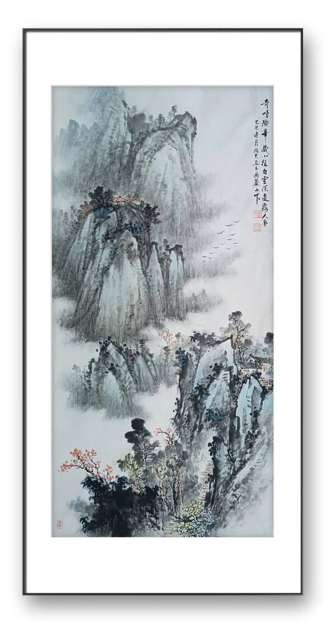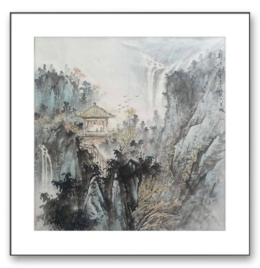 其作品意境首先体现为“雄奇与灵秀共生”。作为湖南籍画家,唐振君先生既受湖湘文化“灵秀灵动”的浸润,又因艺术视野的拓展,吸纳了北方山水的雄浑气魄。其作品中,既有峰峦叠嶂、气势磅礴的宏大格局,百尺悬瀑自山巅倾泻,云雾缭绕于峰峦之间,尽显“西峰峥嵘喷流泉,东崖复沓蔽轻雾”的壮阔;亦有小桥流水、亭台倚岸的雅致,清泉绕石,松涛阵阵,飞鸟掠空,传递出“鸢飞戾天者,望峰息心;经纶世务者,窥谷忘反”的闲适。雄奇中见灵秀,灵秀中藏大气,刚柔相济间,山水的精神特质被展现得淋漓尽致。