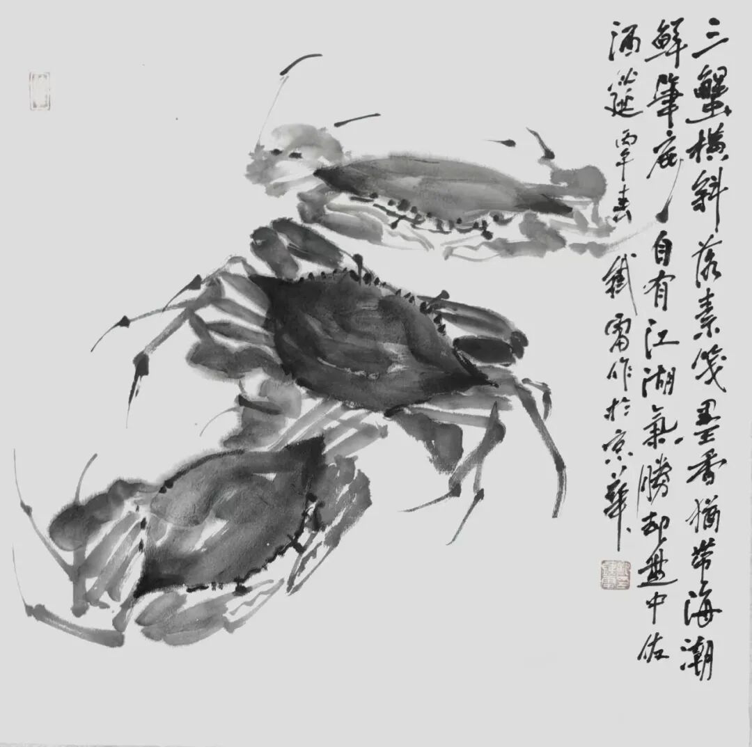 鲍铁雷先生以江南文脉为底、京华笔墨为骨,跳出传统花鸟程式,将寻常海鲜入画,以大写意水墨重构海物之美,把市井烟火升华为文人雅赏,形成独树一帜的“海鲜写意”新风貌。