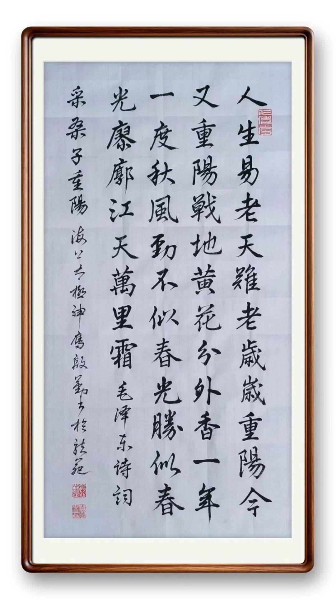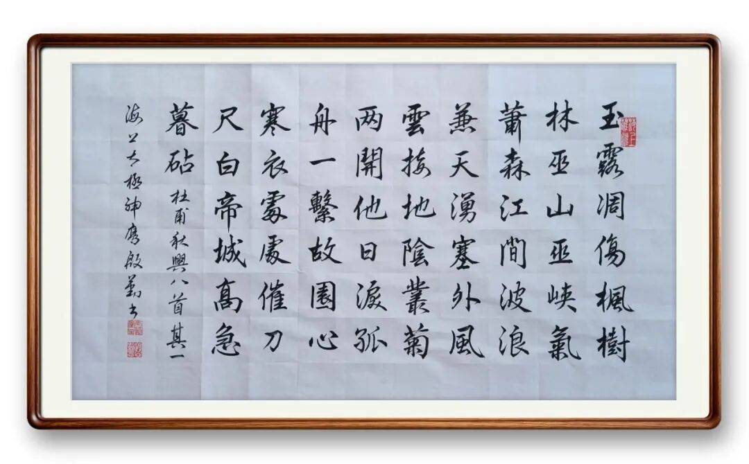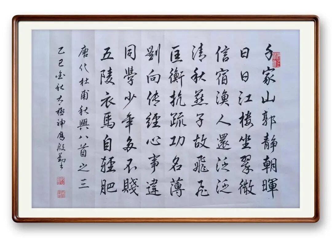 书法之妙,首在笔法,次在气韵,终在心境。先生专攻楷书与行书,其楷书不蹈唐楷刻板,不逐时风轻佻,取正书端庄方正,守楷法严谨法度,笔画平整不僵滞,结体匀称含灵动。点画如太极起势,沉稳有力却不生硬,提按转折间藏锋护尾,如拳术蓄势待发,每一笔都透着笔墨根基的“稳”与内在气韵的“劲”,恰合《宣和书谱》“法度完备,气韵自足”的期许,无刻意雕琢之痕,有自然天成之态。