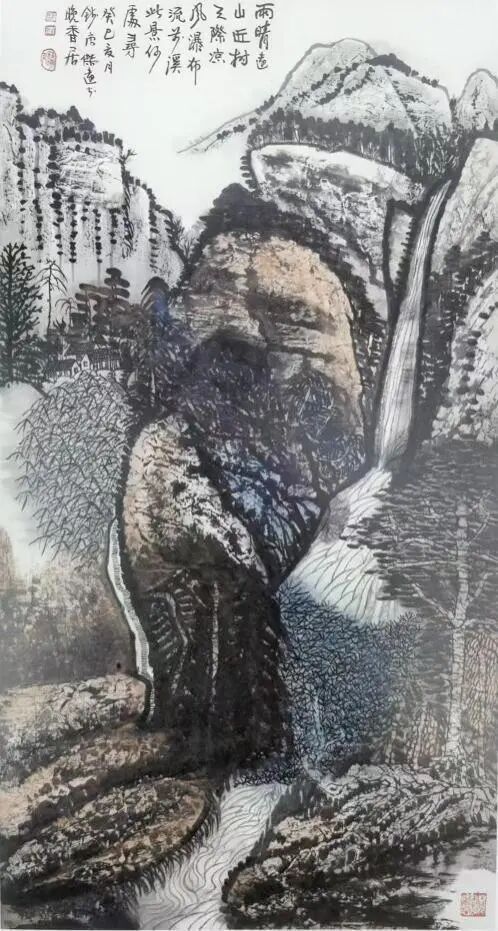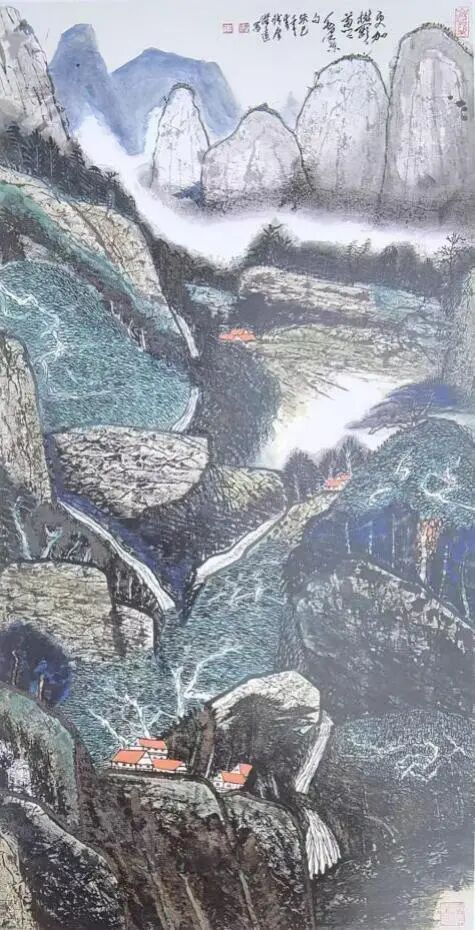 盛杰远的山水画取景宏大,布局苍茫,画面之中层峦叠嶂,云气奔涌,是充满了空间上的张力与节奏。笔墨则工写兼备,以精微笔法勾勒山石肌理、草木形质,又能以淋漓水墨渲染天地气象、光影虚实,使画面既存有具象之真,亦得意象之悠远。远观其作,可见群山巍峨连绵,如龙脊起伏于云海之间,山岩嶙峋,浑厚如铸;近察其中,又见有溪涧迂回,曲径隐现,草木华滋,苔点斑驳,更有疏林茅屋点缀于山谷崖畔。众幅画面题材,或以江南水乡的温润蕴藉为题,春早江边,细雨霏微;或以北地山水的雄健苍茫为题,危崖巨壑,傲然屹立。如此将南北风骨融贯于一身,盛杰远先生,确不愧为大家风范!