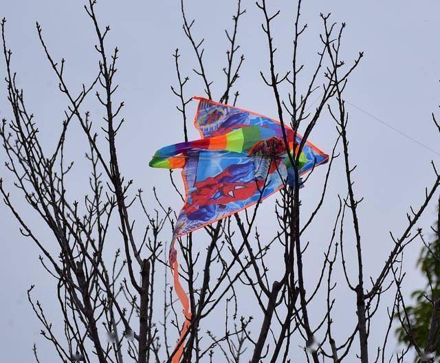 另一小女孩的惊呼带着失落——一只蓝色蝴蝶纸鸢不慎缠上未发芽的柿树枝桠,粉嫩圆脸上写满怏怏。