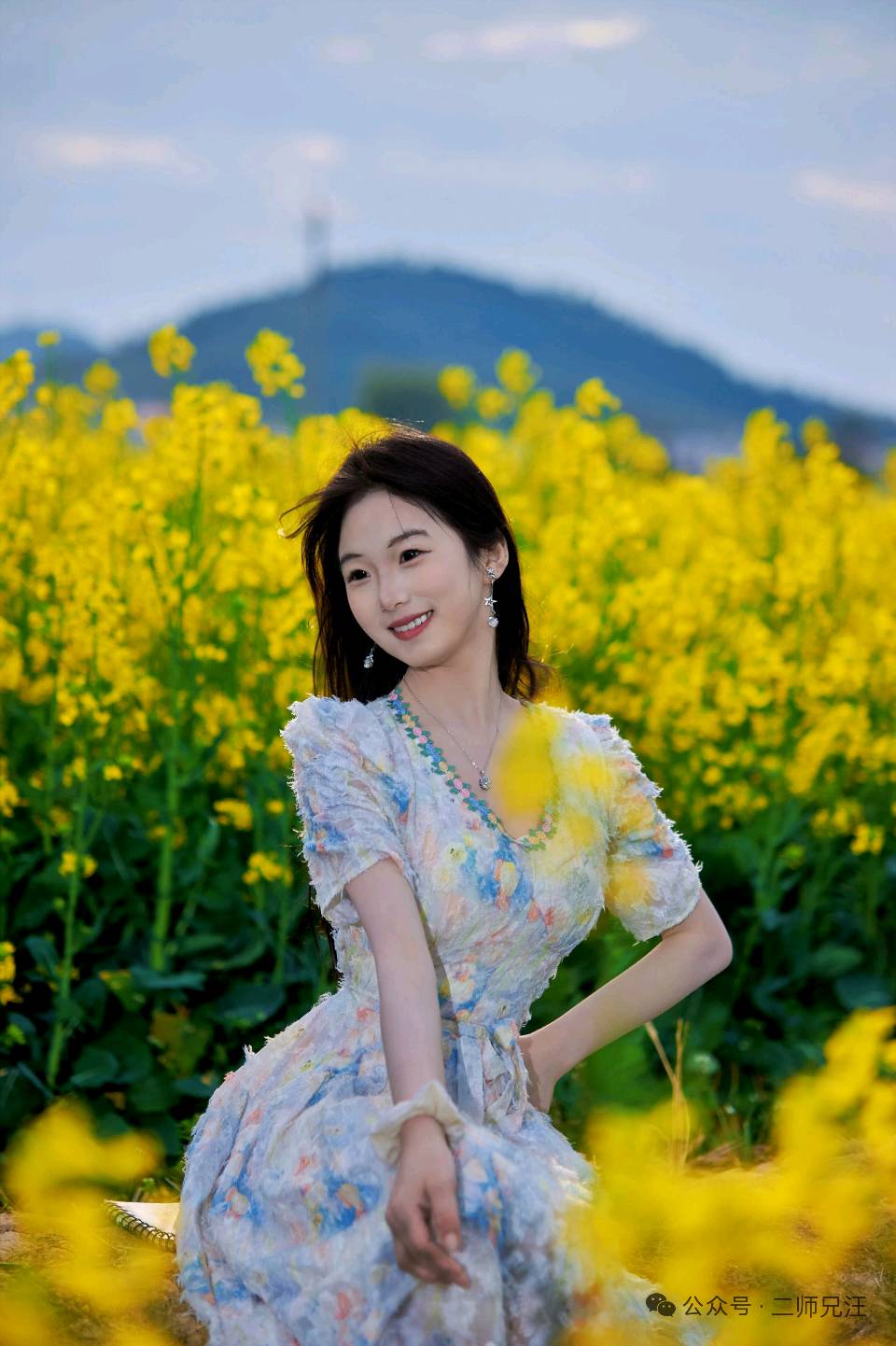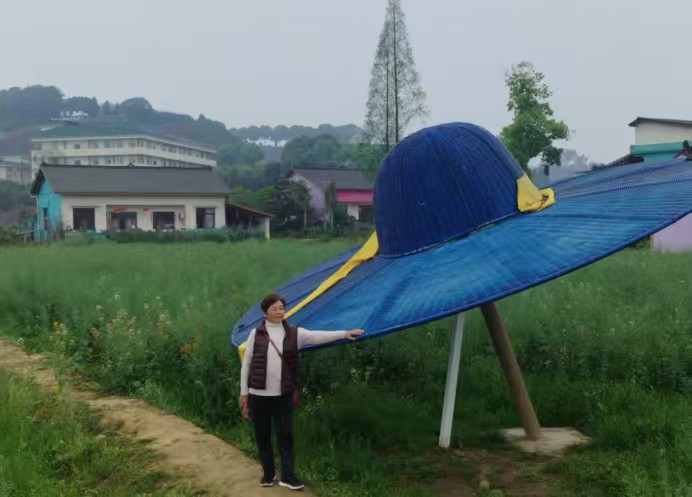 车停免费停车场,脚步便慢了下来。小河如碧带绕村,柳丝蘸水轻摇,风里裹着河水的清甜与油菜的淡香。最先撞入眼帘的,是村口那顶巨型草帽塑像——蓝色竹篾纹理清晰可触,帽沿系着黄飘带,既像农人的草帽,又似大地的冠冕,别致中透着亲切。杨姐与韩小妹依偎草帽边缘,张董举着相机穿梭取景,将柳枝新绿、笑靥与远处茶园墨绿层次一并定格。彩石围砌的台阶上,“颜坝”二字苍劲醒目,笔锋间似有山泉流淌,成为这片新生村落最鲜明的文化印记。