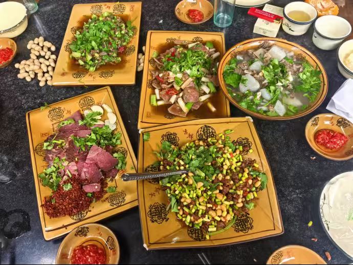 正午围坐一桌,正宗全牛席上桌,牛肝滑嫩、牛肚爽脆、回锅牛肉焦香、黄豆牛肉酥软、青菜炒牛肉清爽,汤锅翻滚间热气蒸腾,每道菜各有风味,热汤暖肠,佳肴适口。四家人围坐,有说有笑,谈天说地,忆童年趣事,感人生况味,享当下安然。身份与职业在此刻都淡去,只剩老友相聚的真诚与松弛。