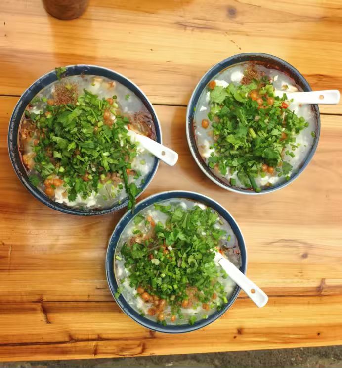 游罢颜坝,便往新场镇寻味。商副县因走时匆忙忘记带烟草,车刚停妥,便急步寻烟市,穿街过巷终在一家老铺如愿以偿。拿着新卖的烟叶来到豆腐脑摊桌旁,边裹着烟边品尝豆腐脑,碗中豆腐脑未吃完就见袅袅烟雾升腾,我调侃道:“又要使用‘核武器’(四川人常把土烟称为核武器)了哦,怎不把你的核武器拿去对付美国日本喃?”逗得大家一阵欢笑。新场的豆腐脑确地道,嫩如凝脂,鲜香入味,是夹江人刻在骨子里的烟火滋味。