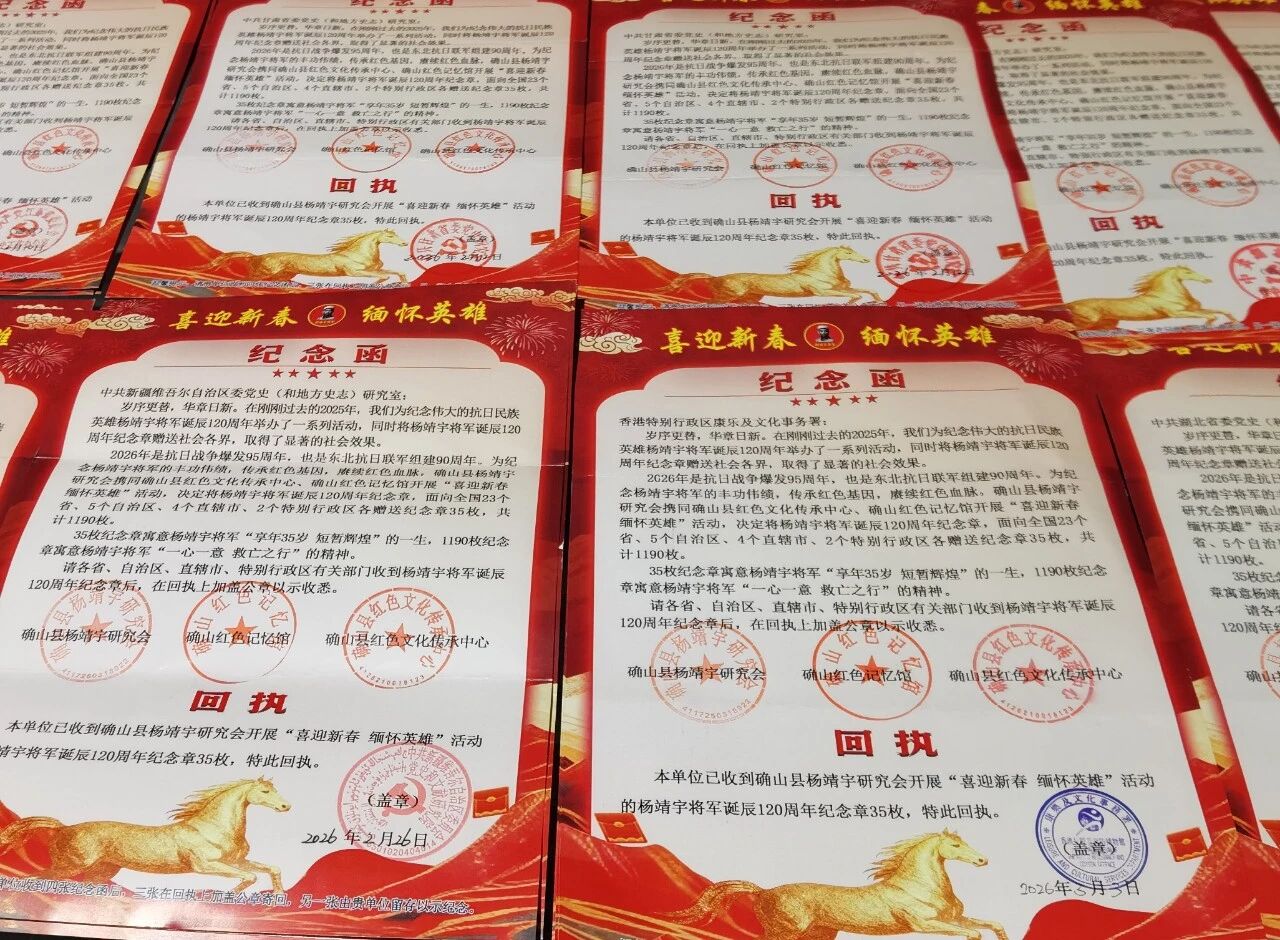 3月21日,随着香港康乐及文化事务署回执公函顺利抵达,由河南省确山县杨靖宇研究会、确山县红色文化传承中心、确山红色记忆馆联合主办的“喜迎新春 缅怀英雄”主题纪念活动圆满落幕。小小纪念章跨越千里,将抗日民族英雄杨靖宇的赤胆忠心与家国情怀,传递到祖国大江南北。
