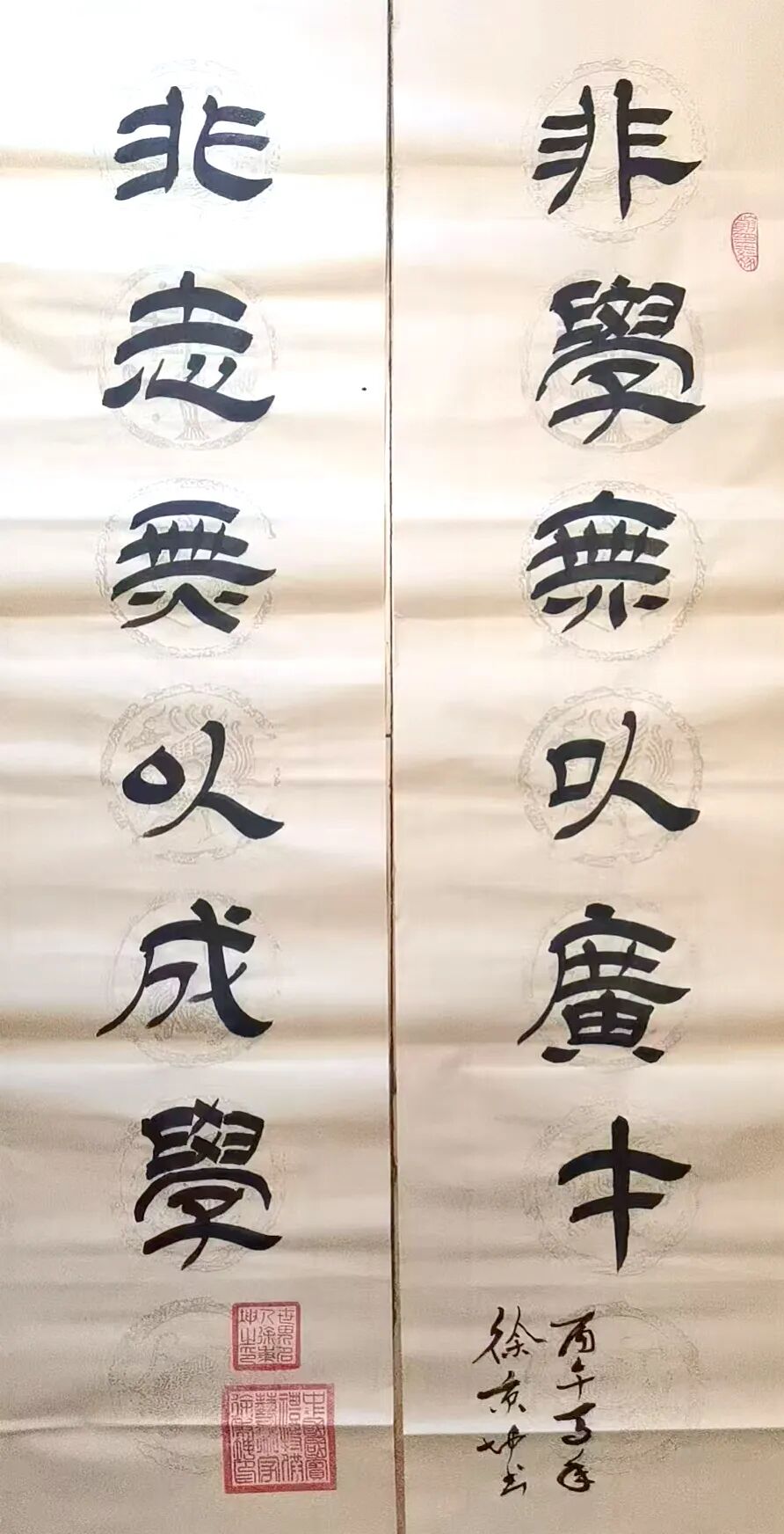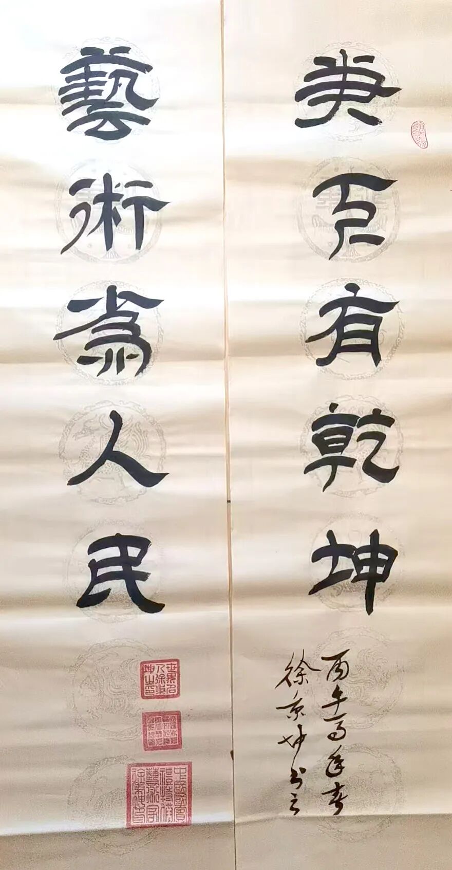 徐秉坤先生篆书直追三代秦汉,于古穆中见灵动,深研甲骨、钟鼎、石鼓诸体,得古人结字精微而重塑风神,使千年古文字在其腕下焕发出新的生命力。先生之隶书,堪称当代一绝。其融《张迁》之雄强、《礼器》之劲健、《乙瑛》之温润、《石门》之开张于一炉,结体宽博恢弘,用笔沉厚老辣。蚕头蓄势如岳峙渊渟,雁尾舒展若云卷云舒,更将隶书静态与行草流动巧妙相合,满幅笔墨精严而气脉贯通,于端庄中见灵动,于法度中显性灵,直抵“从心所欲而不逾矩”之化境。细观其隶书作品,点画之间既有金石之质,又具书卷之气,可谓兼得雄秀二美。