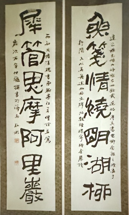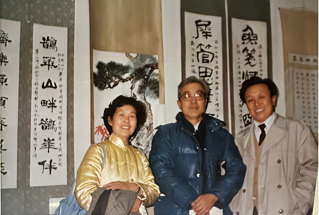 “鱼笺”指书信用纸,多用于书信来往;“犀管”古代文房用具的雅称,在这里指赵天行先生文思敏捷,身份特殊,是对赵天行先生书法艺术的称赞。唐代王勃在《七夕賦》中以,“握犀管,展鱼笺”构建出文人雅集的典型场景,将犀管与鱼笺并置;“情绕”与“思摩(研究)”相对;明湖柳指大明湖的柳树,阿里岩指台湾阿里山的石头,明湖指赵天行先生的故乡,阿里指台湾的阿里山,赵天行先生的现居住地。可见,耿彬先生拟的此副对联是何等的工整,寓意是多么恰如其分啊!赵天行先生和耿彬先生的这两副嘉联在1984年,同时入选在北京中国美术馆举办的首届“海峡两岸书画展”,当时,中国科学院院士严济慈亲临现场并剪彩。耿彬先生夫妇应邀参加了开幕式,并与中国书法家协会副主席刘艺先生合影留念。